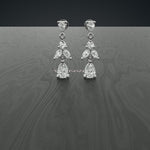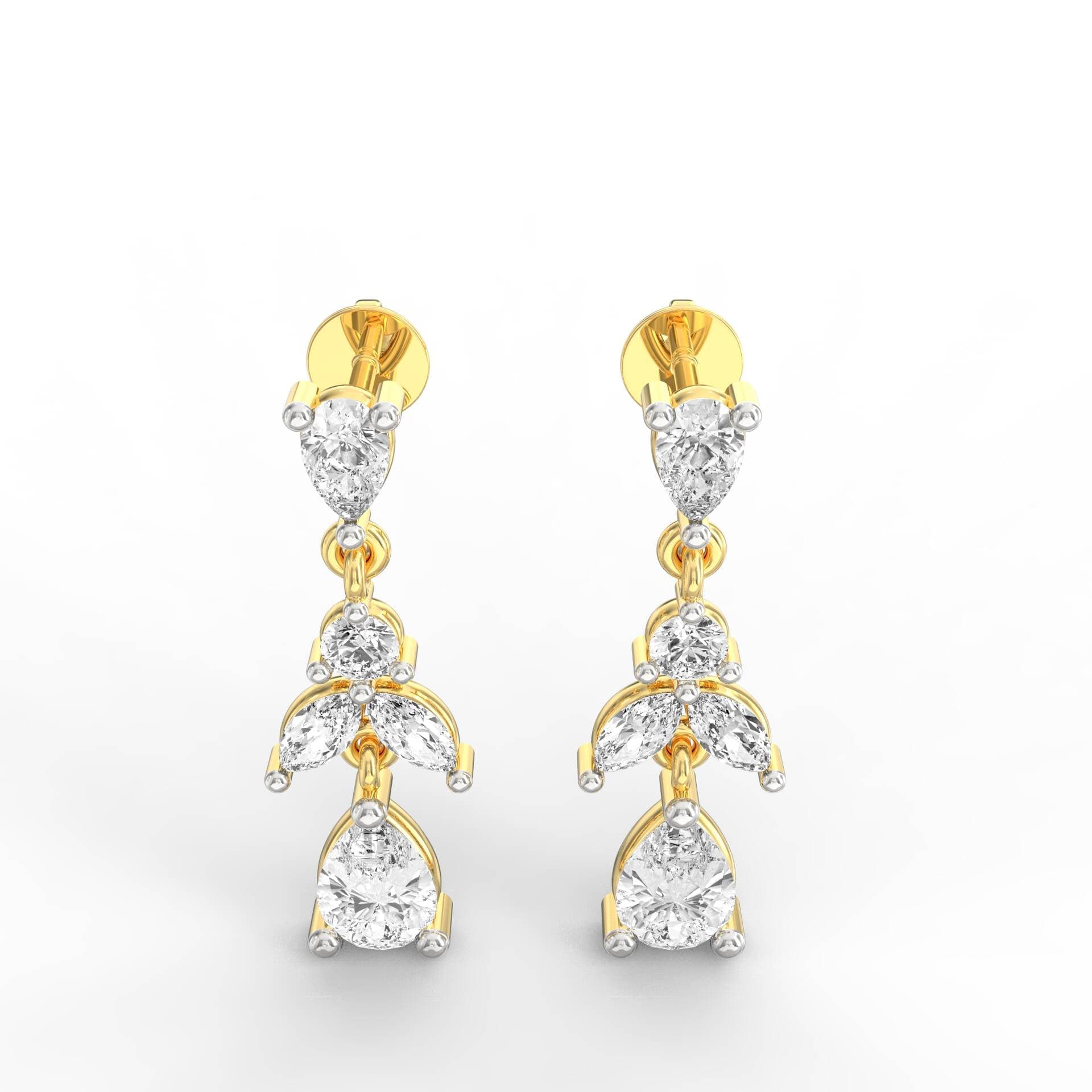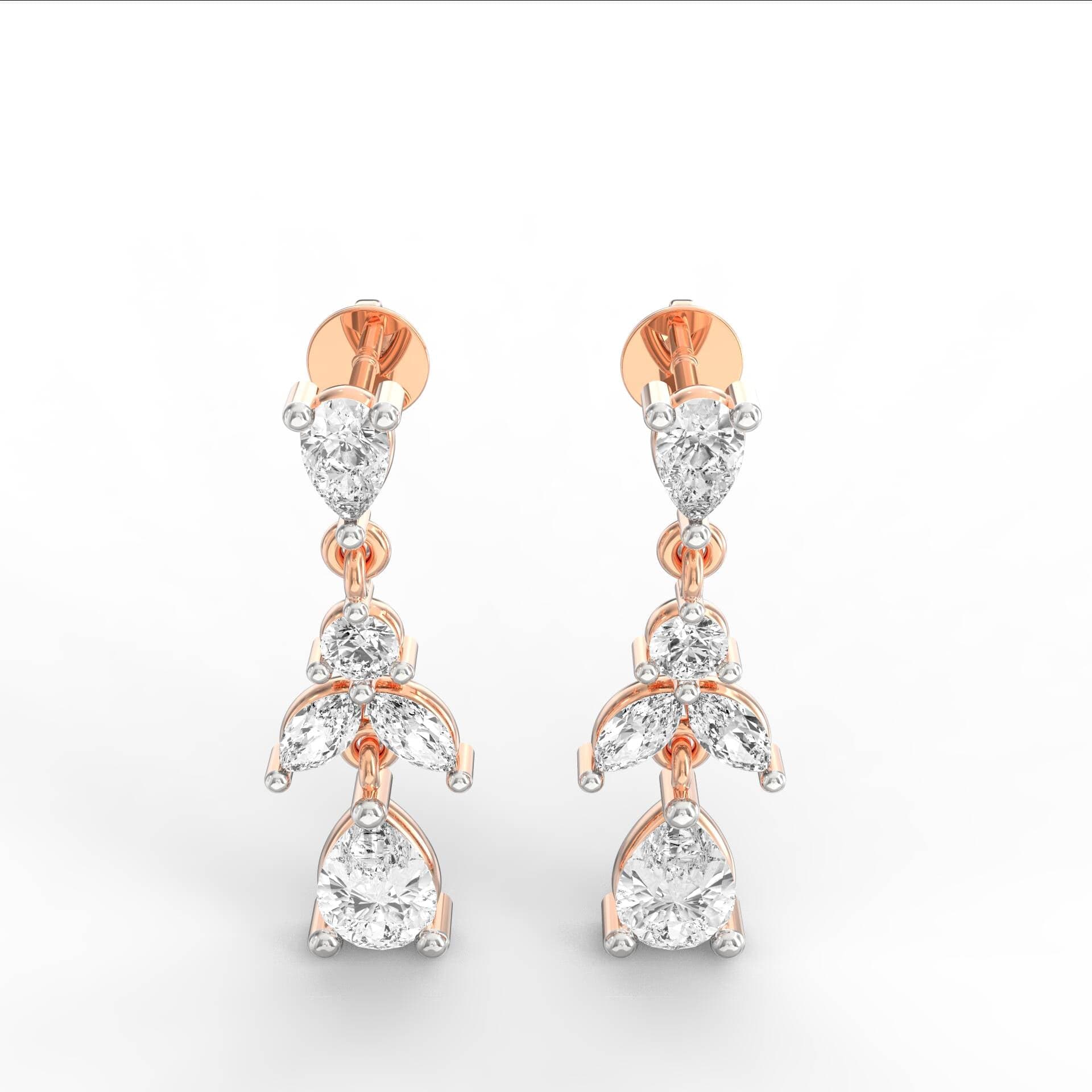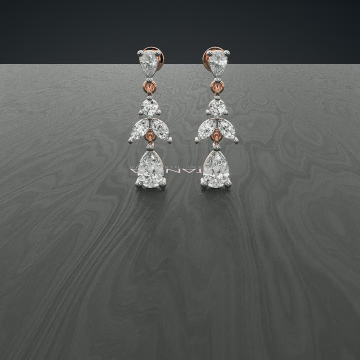 These elegant drop earrings showcase a cascading leaf-inspired design, crafted with pear, marquise, and round motifs. The visual symmetry and delicate articulation reflect the essence of blooming foliage. Each segment transitions gracefully, ending in a sparkling pear-shaped base that adds balance and sophistication to the silhouette.