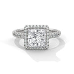 The Aurelia lab grown diamond ring blends architectural precision with feminine radiance. At its centre glows a 1.60 Ct princess-cut solitaire, admired for its sharp symmetry and defined edges. A halo of glittering accent diamonds surrounds the centre stone, enhancing its brilliance and creating a breathtaking frame of light. Meanwhile, the pavé-set band adds continuous sparkle, making every angle of this ring captivating.