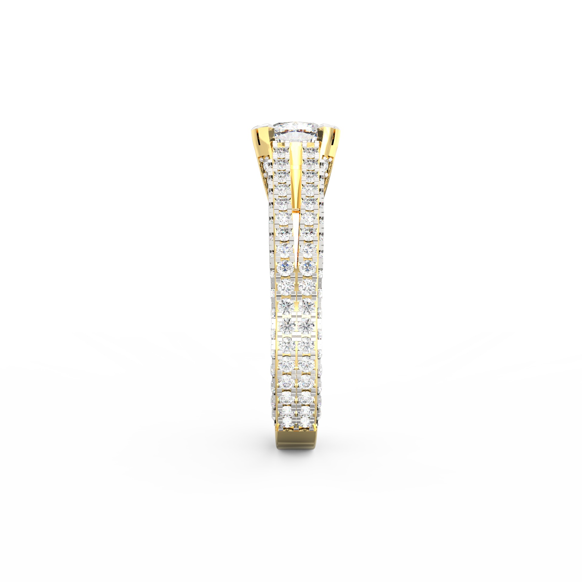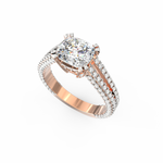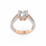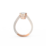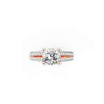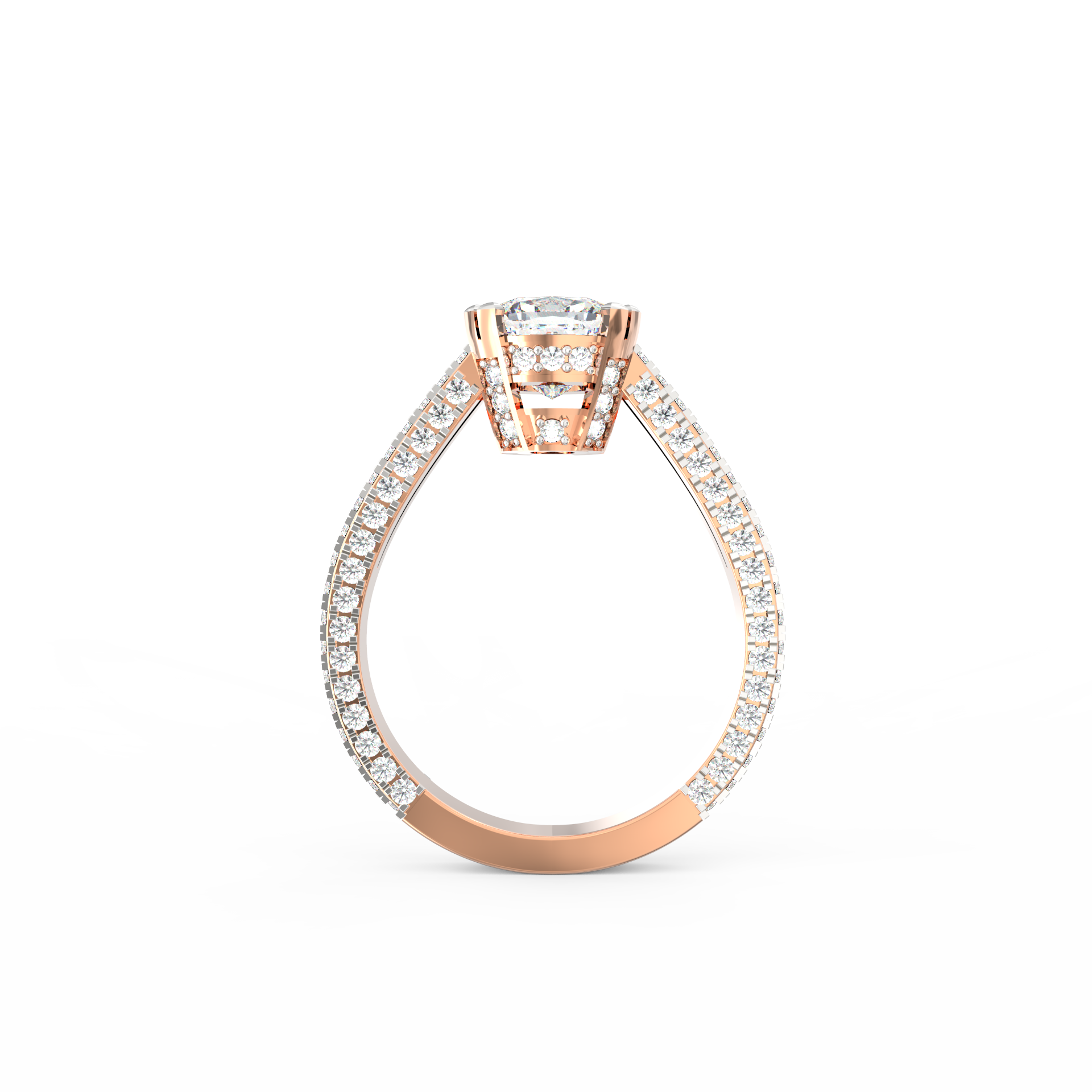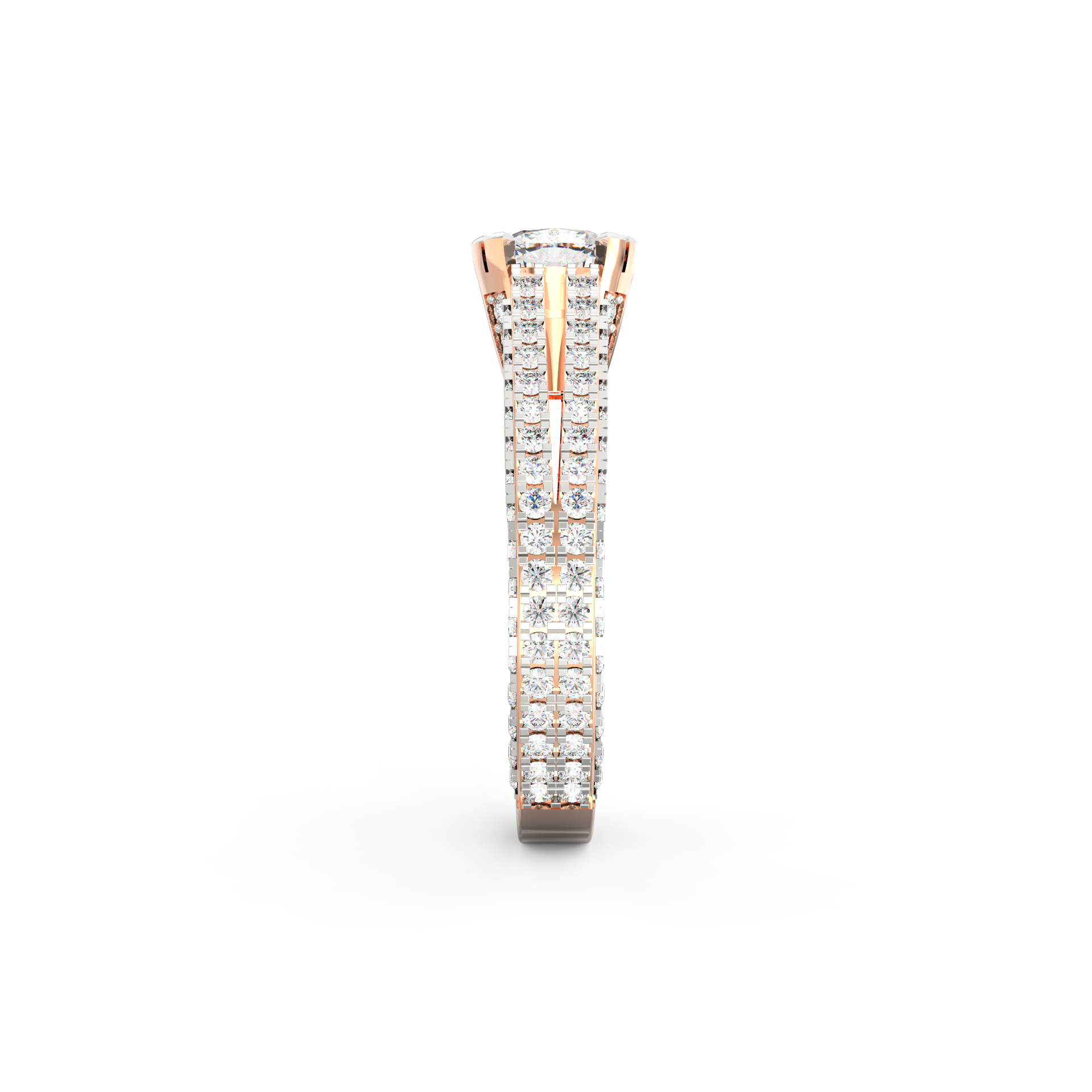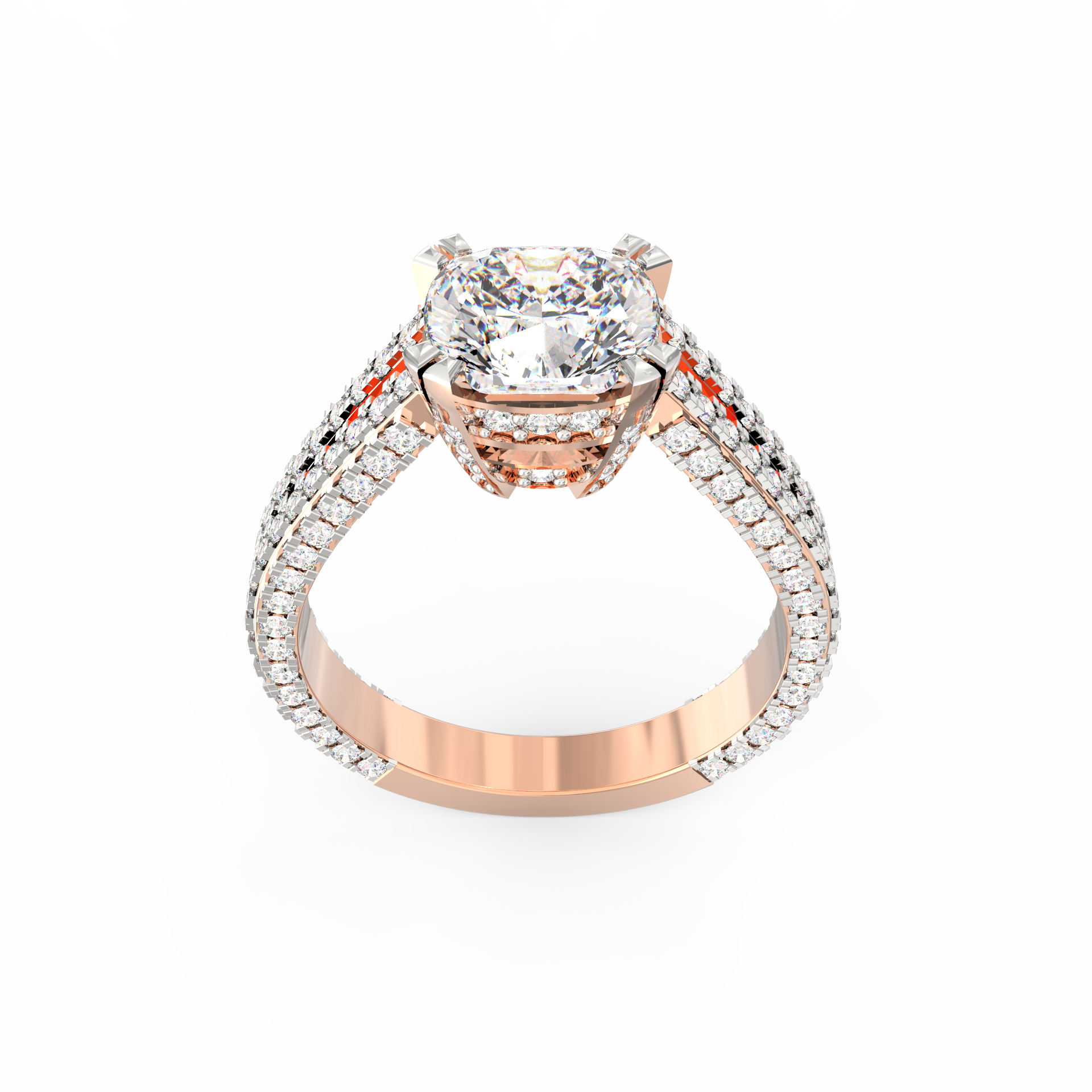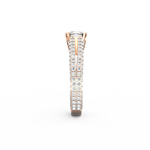 Surrounding the solitaire are 166 round-cut accent diamonds, arranged in a bold triple-row pattern. This layout adds volume and texture, giving the ring a sculpted look that feels both refined and expressive. The dual-tone band, combining rose and white hues, brings a sense of balance — passion on one side, purity on the other. Each diamond has VS2+ clarity and G+ color, offering clean sparkle and consistent shine.