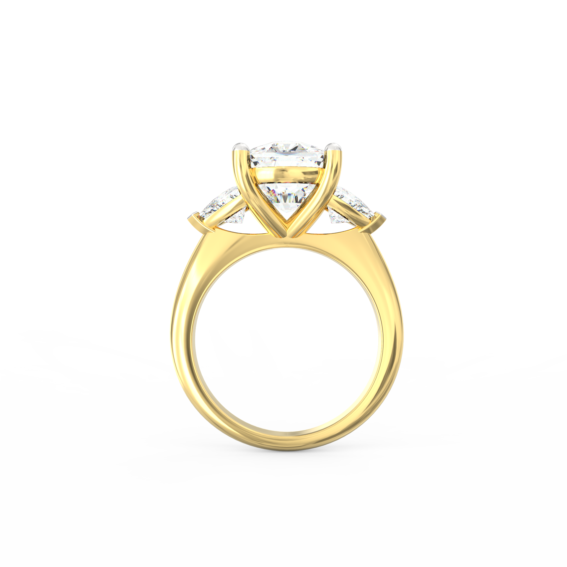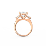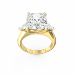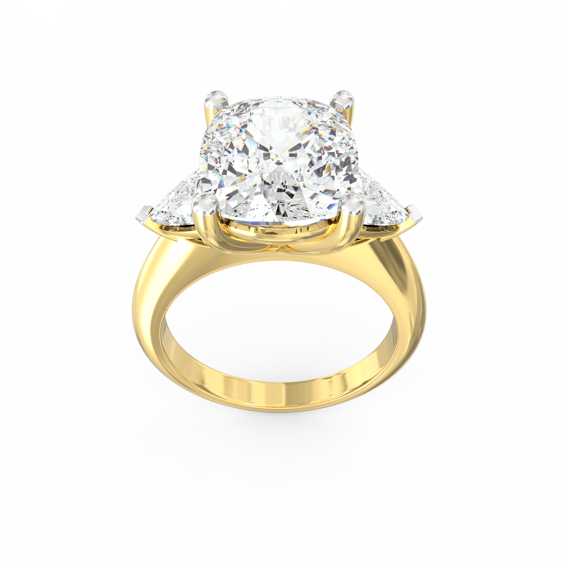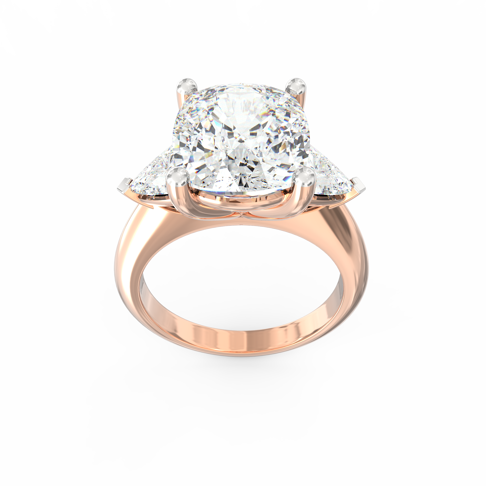 The Ratnākara lab grown diamond ring is a masterpiece that embodies abundance, elegance, and balance. At its centre rests a magnificent 6.35 Ct cushion-cut lab grown diamond, celebrated for its soft corners and fiery brilliance. Flanking the centre stone are two 1.10 Ct trillion-cut diamonds, adding symmetry, sparkle, and architectural harmony to the design. Together, these elements create a ring that radiates majesty from every angle.
