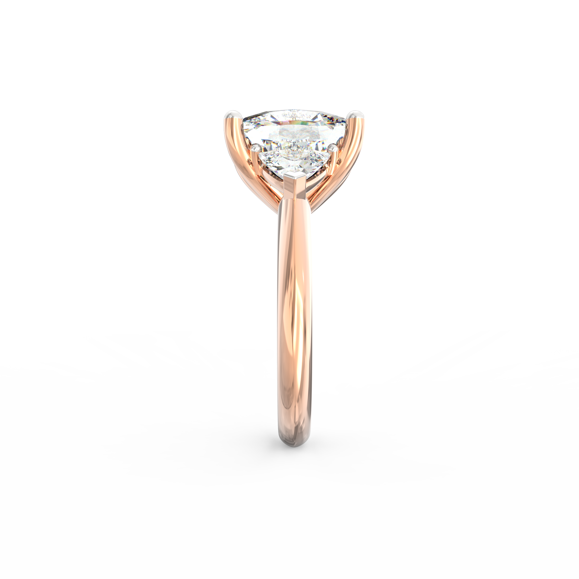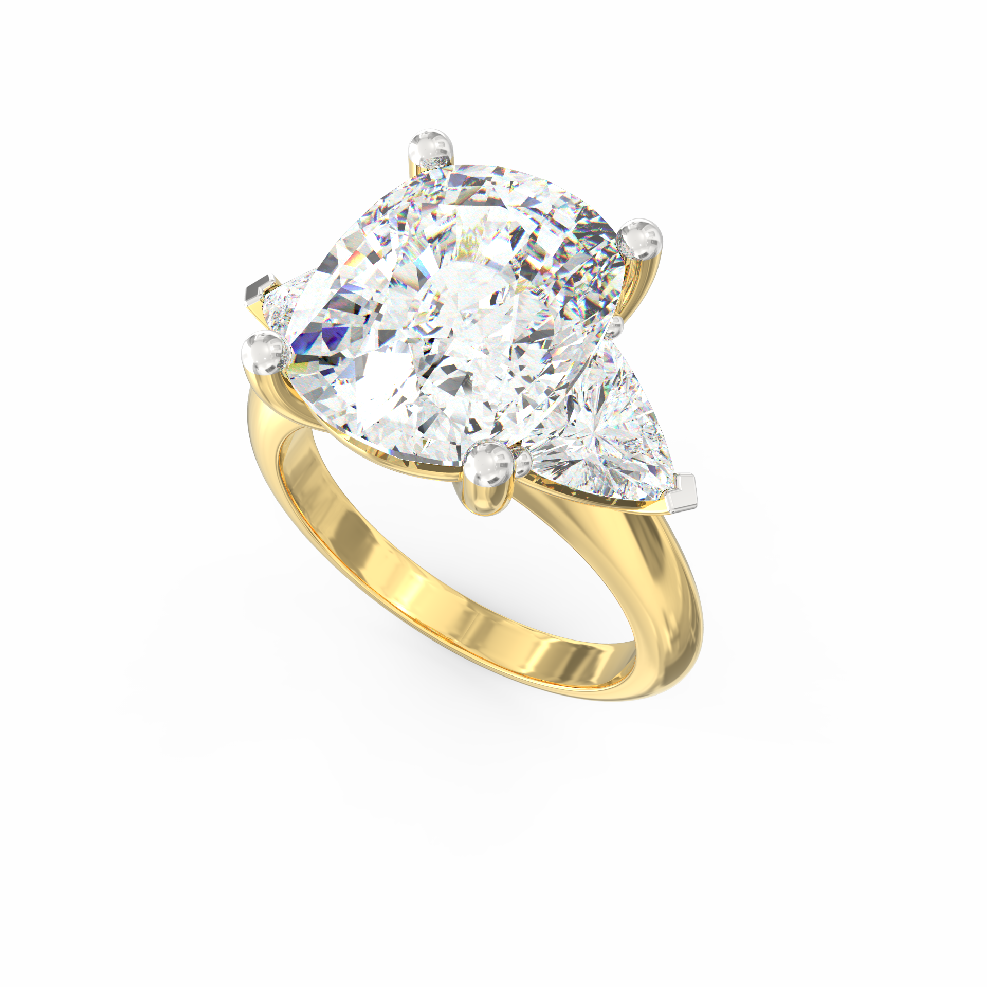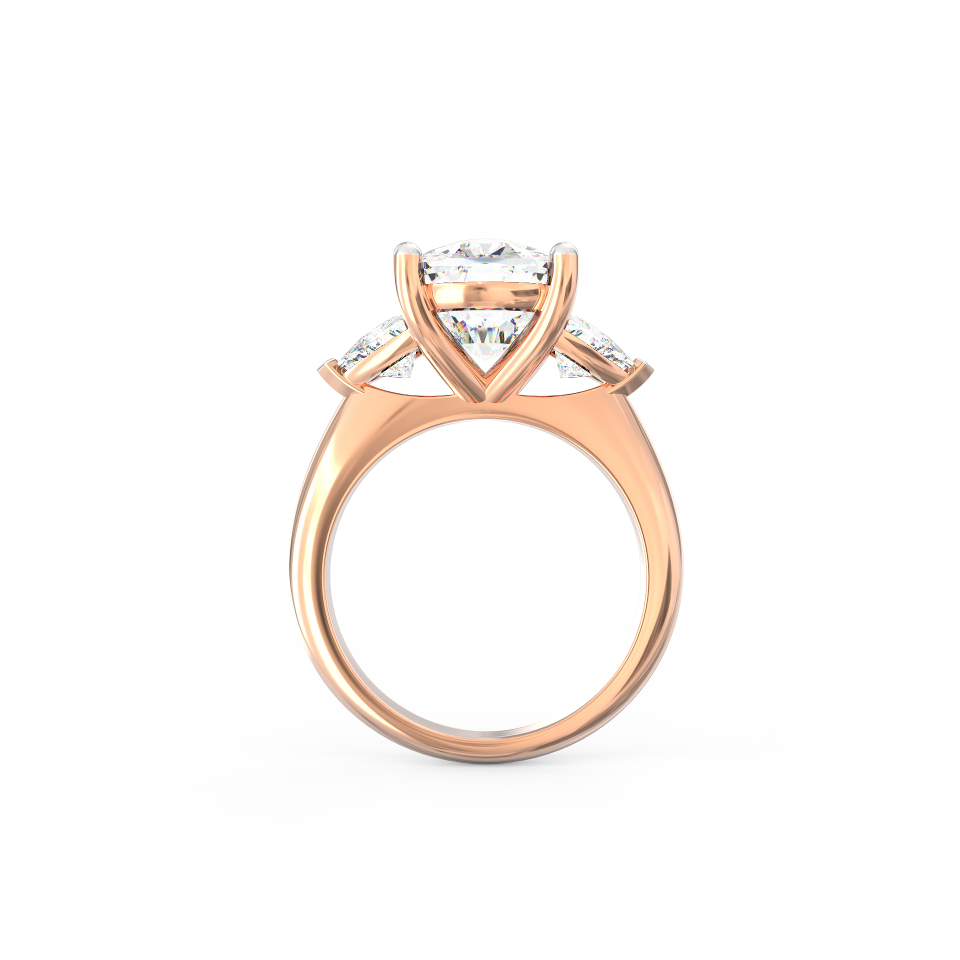The Ratnākara lab grown diamond ring is a masterpiece that embodies abundance, elegance, and balance. At its centre rests a magnificent 6.35 Ct cushion-cut lab grown diamond, celebrated for its soft corners and fiery brilliance. Flanking the centre stone are two 1.10 Ct trillion-cut diamonds, adding symmetry, sparkle, and architectural harmony to the design. Together, these elements create a ring that radiates majesty from every angle.