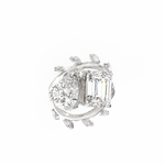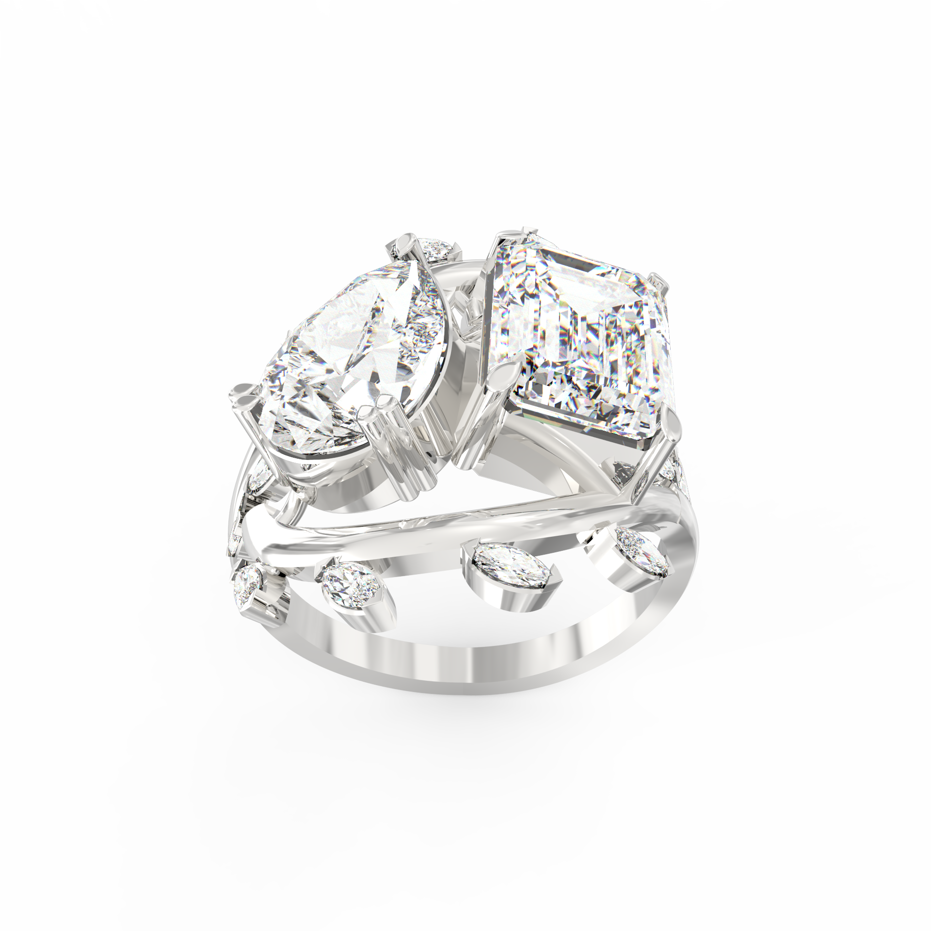 At its heart sit two striking solitaires — a 2.50 Ct emerald-cut diamond and a 2.00 Ct pear-cut diamond.