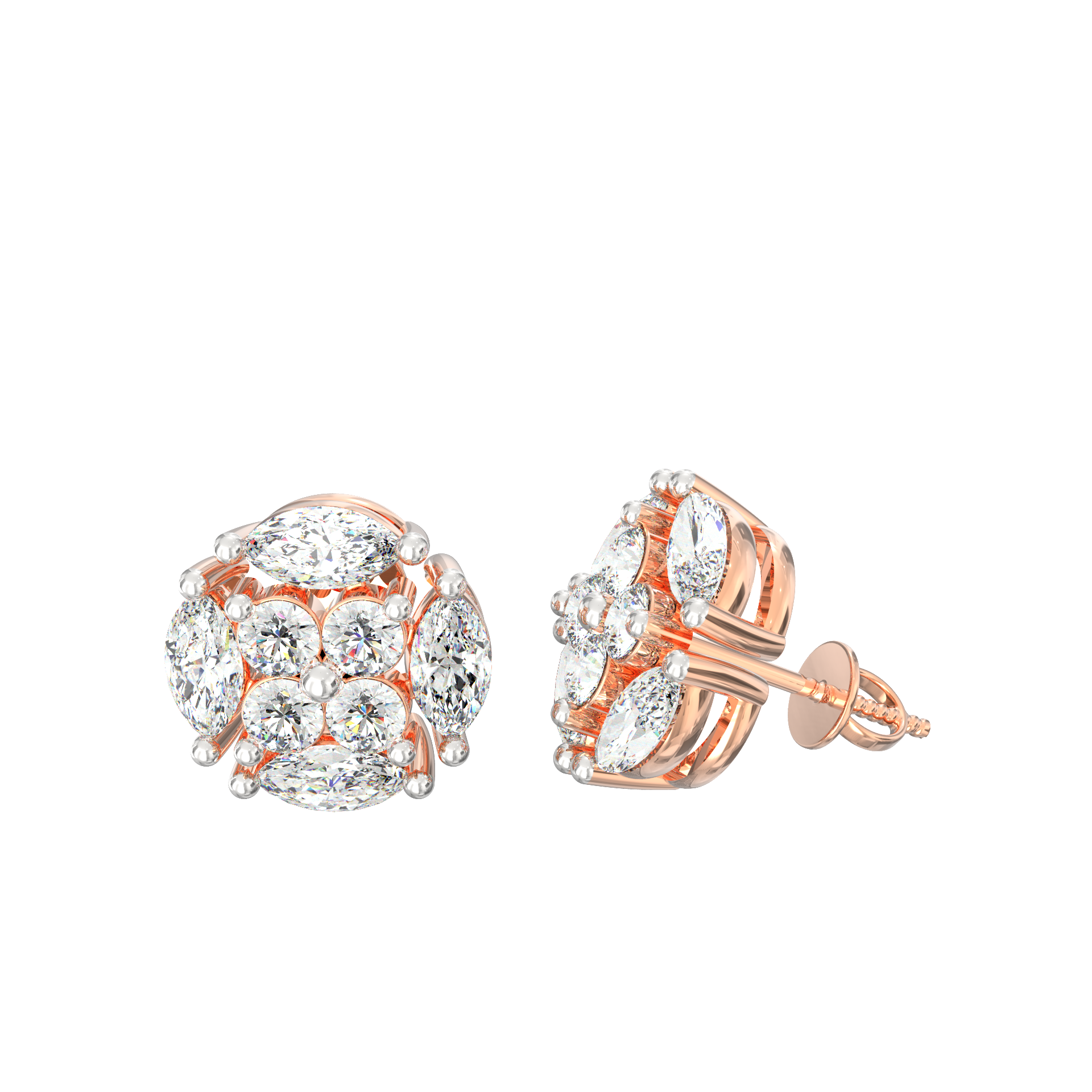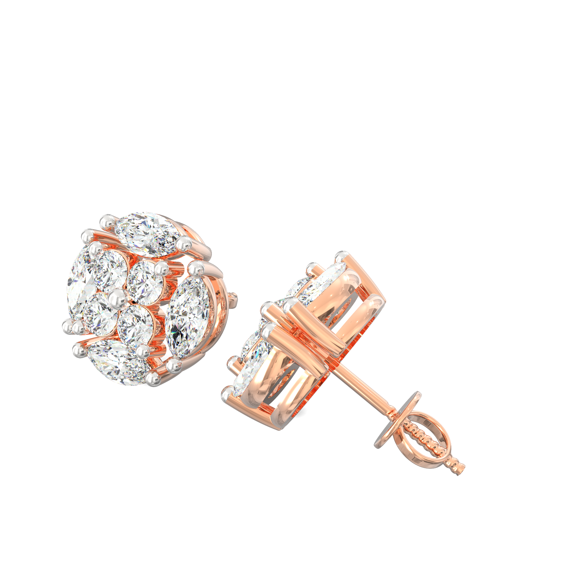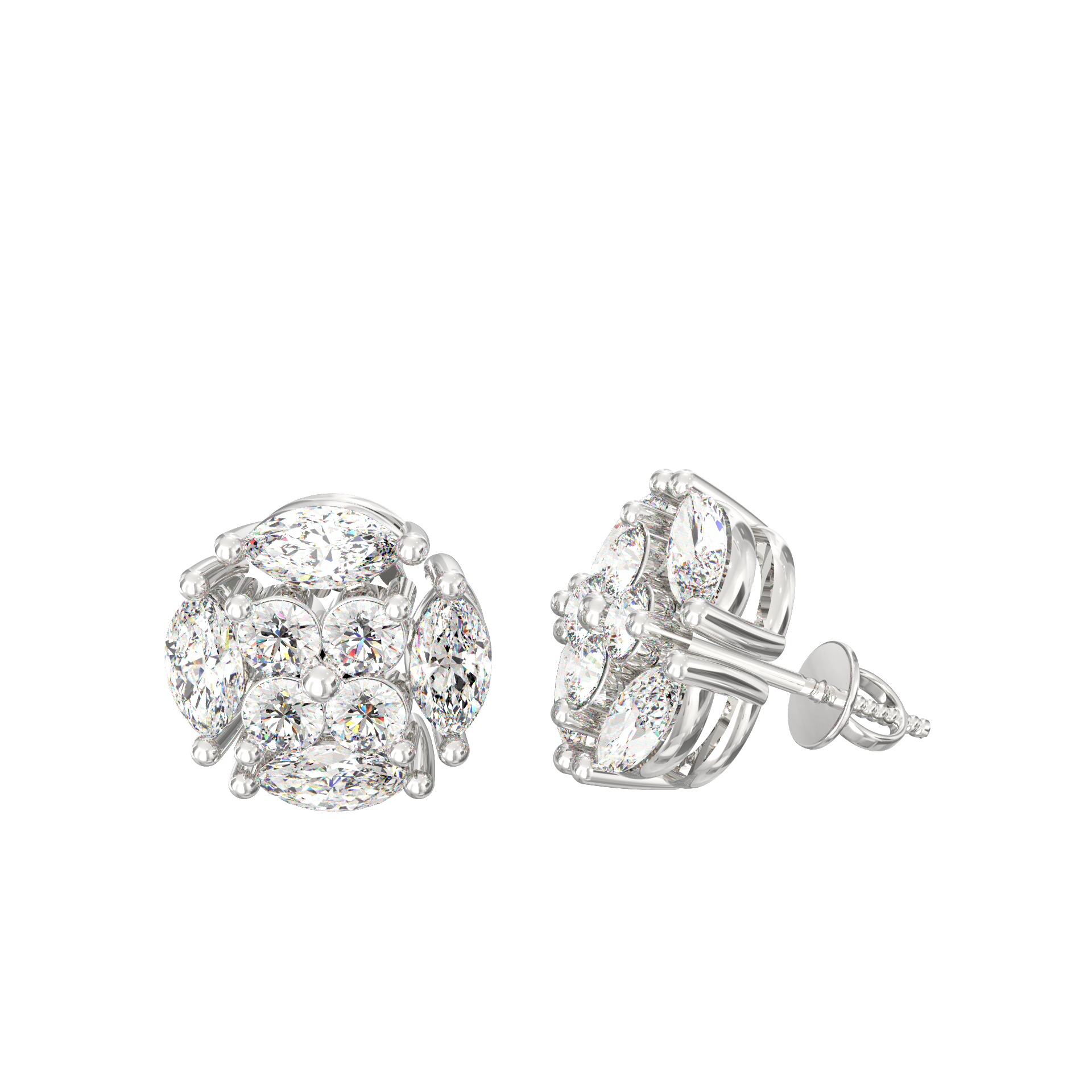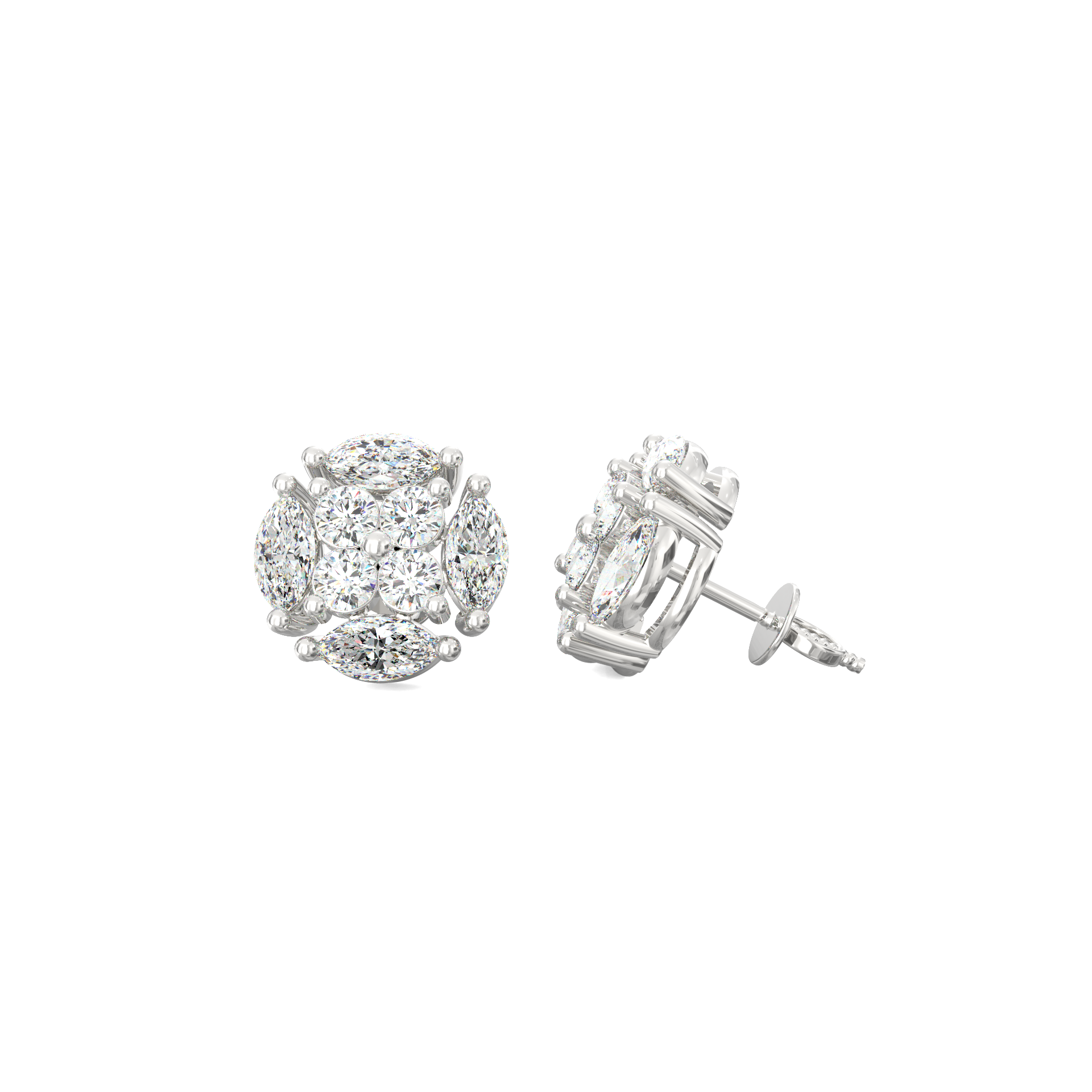 The Florina Bloom lab grown diamond floral stud earrings combine symmetry, symbolism, and sparkle in one timeless creation. Each earring features a precise arrangement of marquise and round-cut lab grown diamonds that form a radiant blossom. The 8 marquise stones (0.96 Ct) shape graceful petals, while 8 round diamonds (0.48 Ct) illuminate the center—together totaling 1.44 carats of conscious brilliance.