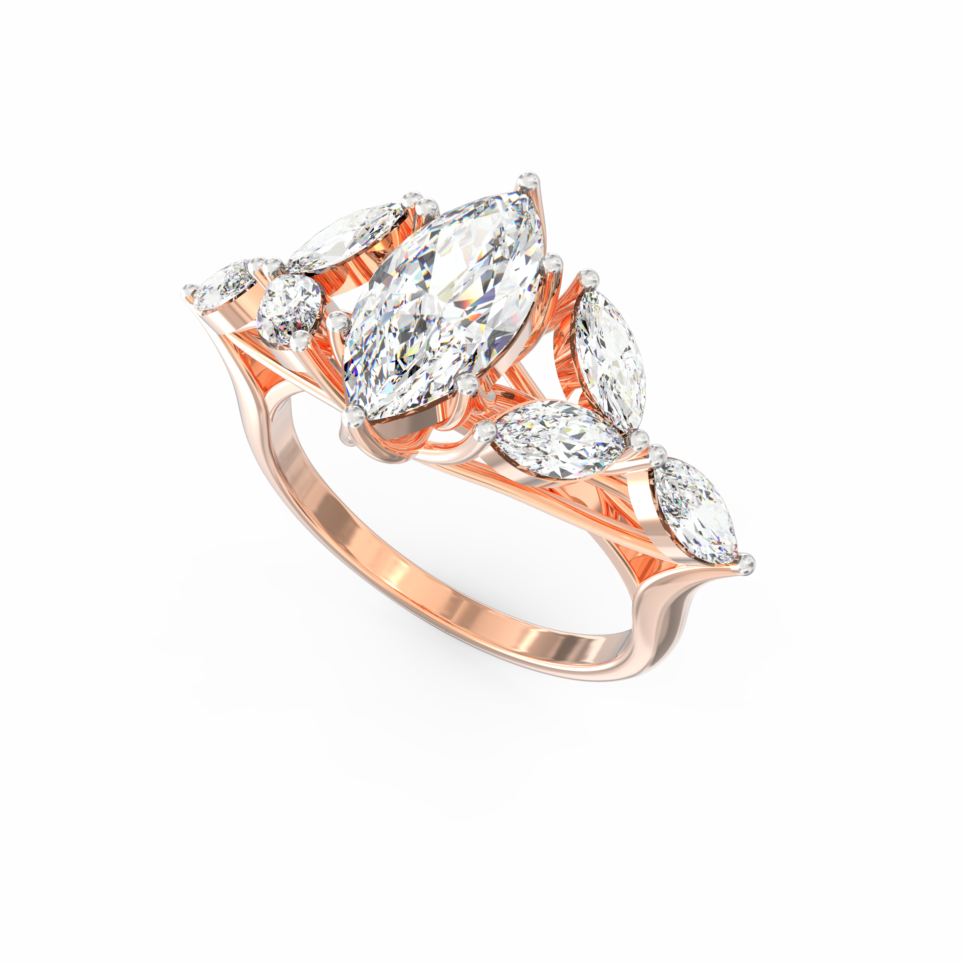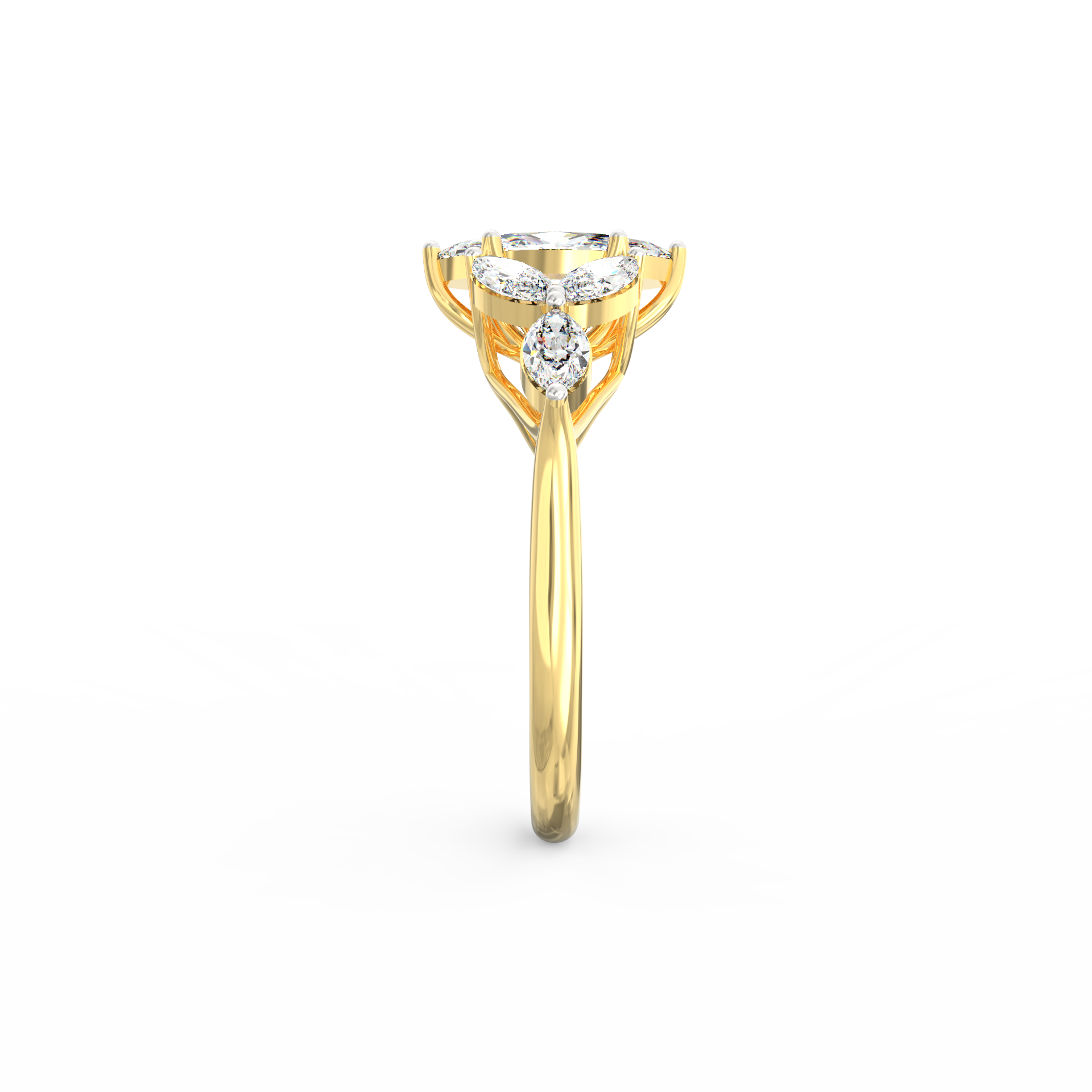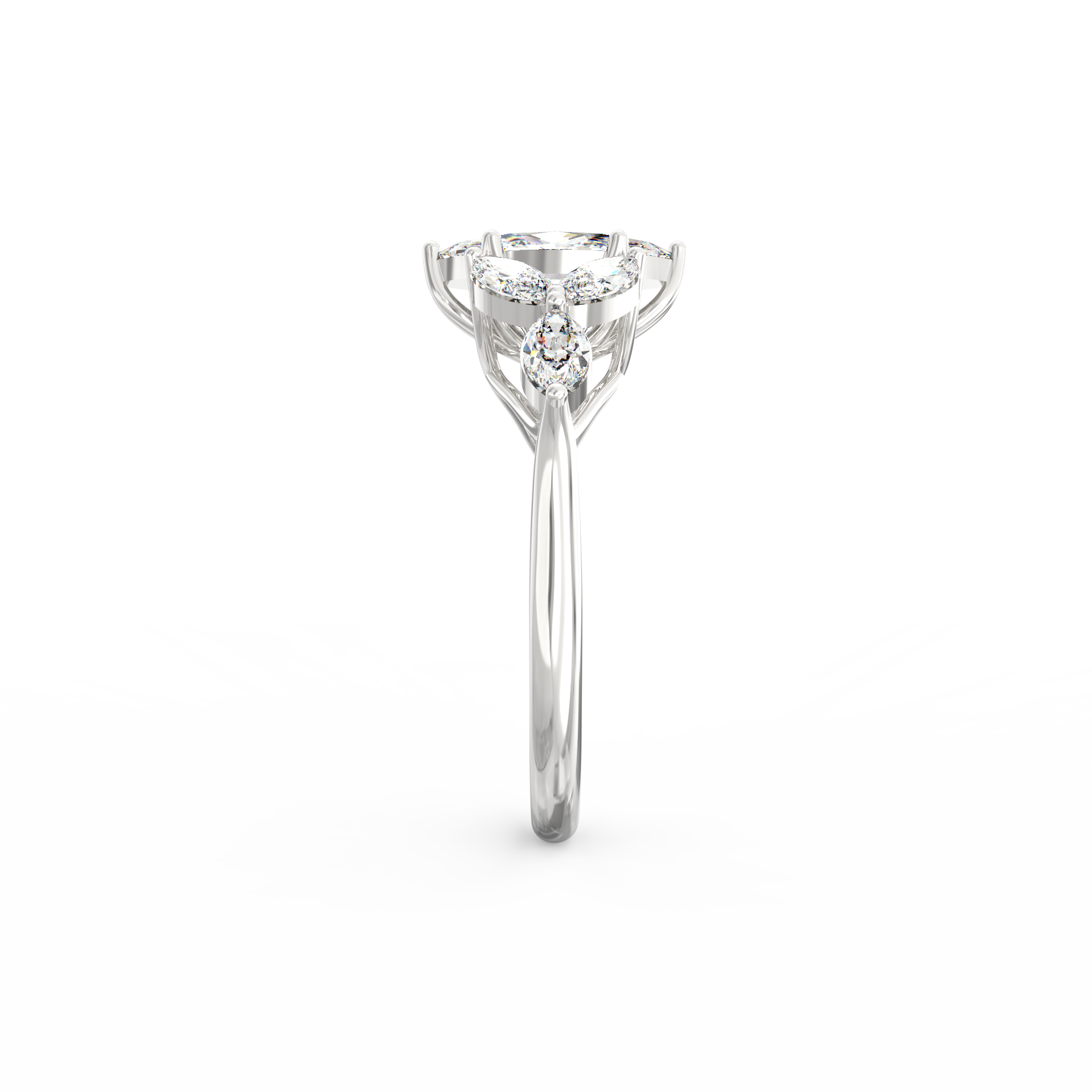At its heart glows a 1.45 Ct marquise-cut ethical lab grown diamond, surrounded by six matching marquise stones totalling 1.44 Ct.