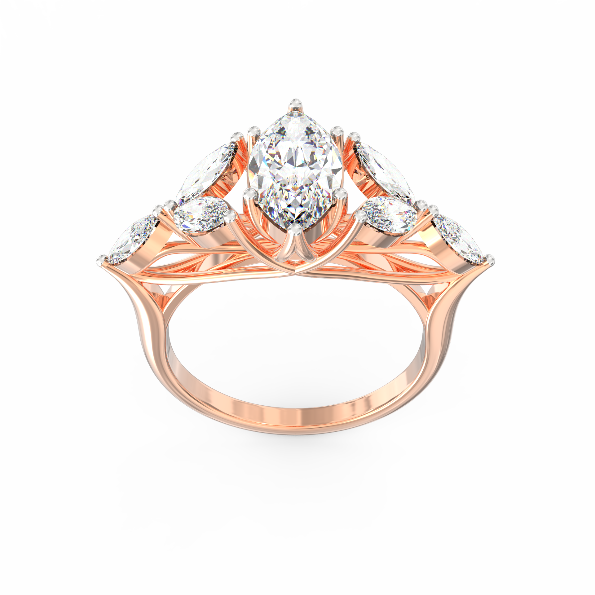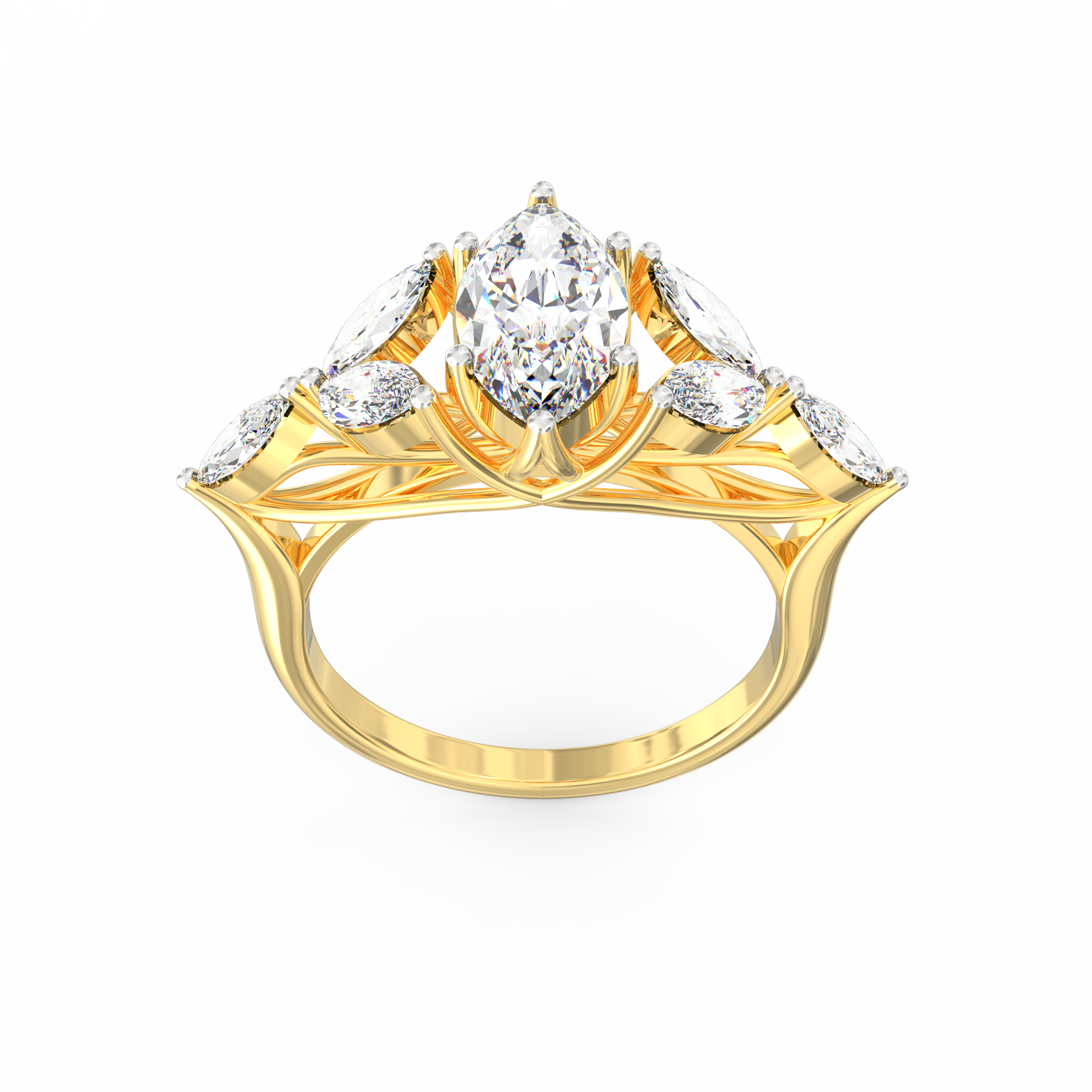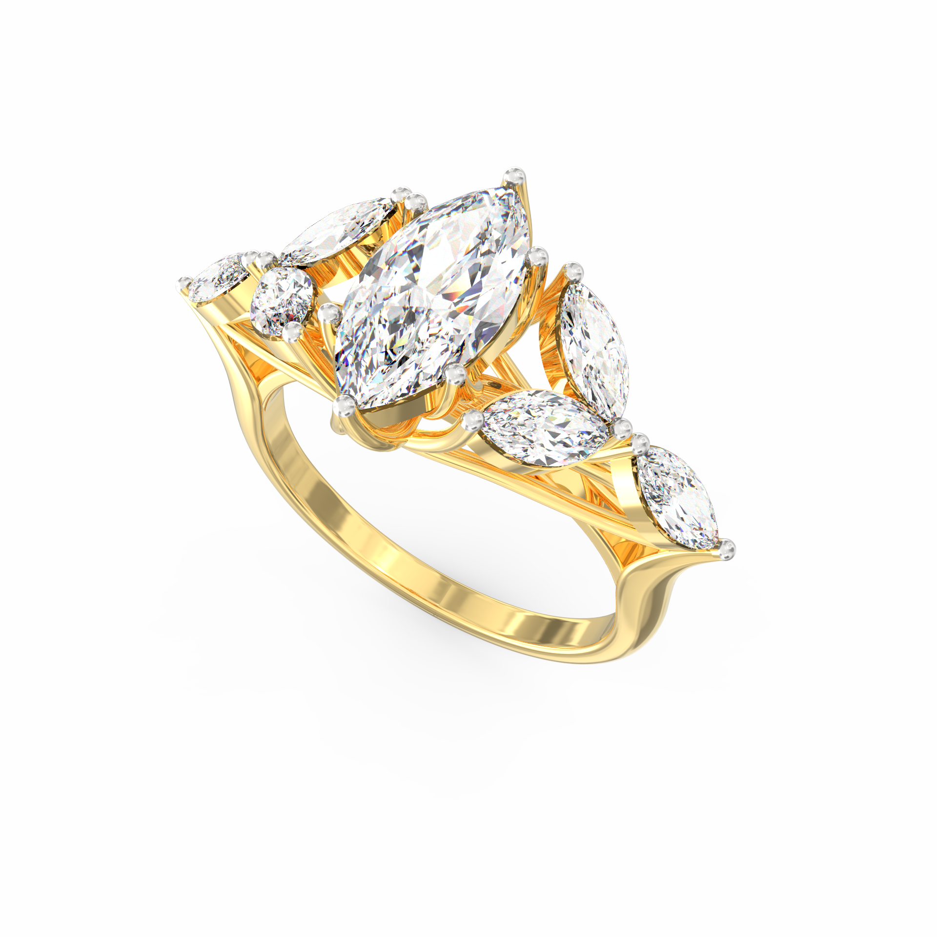At its heart glows a 1.45 Ct marquise-cut ethical lab grown diamond, surrounded by six matching marquise stones totalling 1.44 Ct.