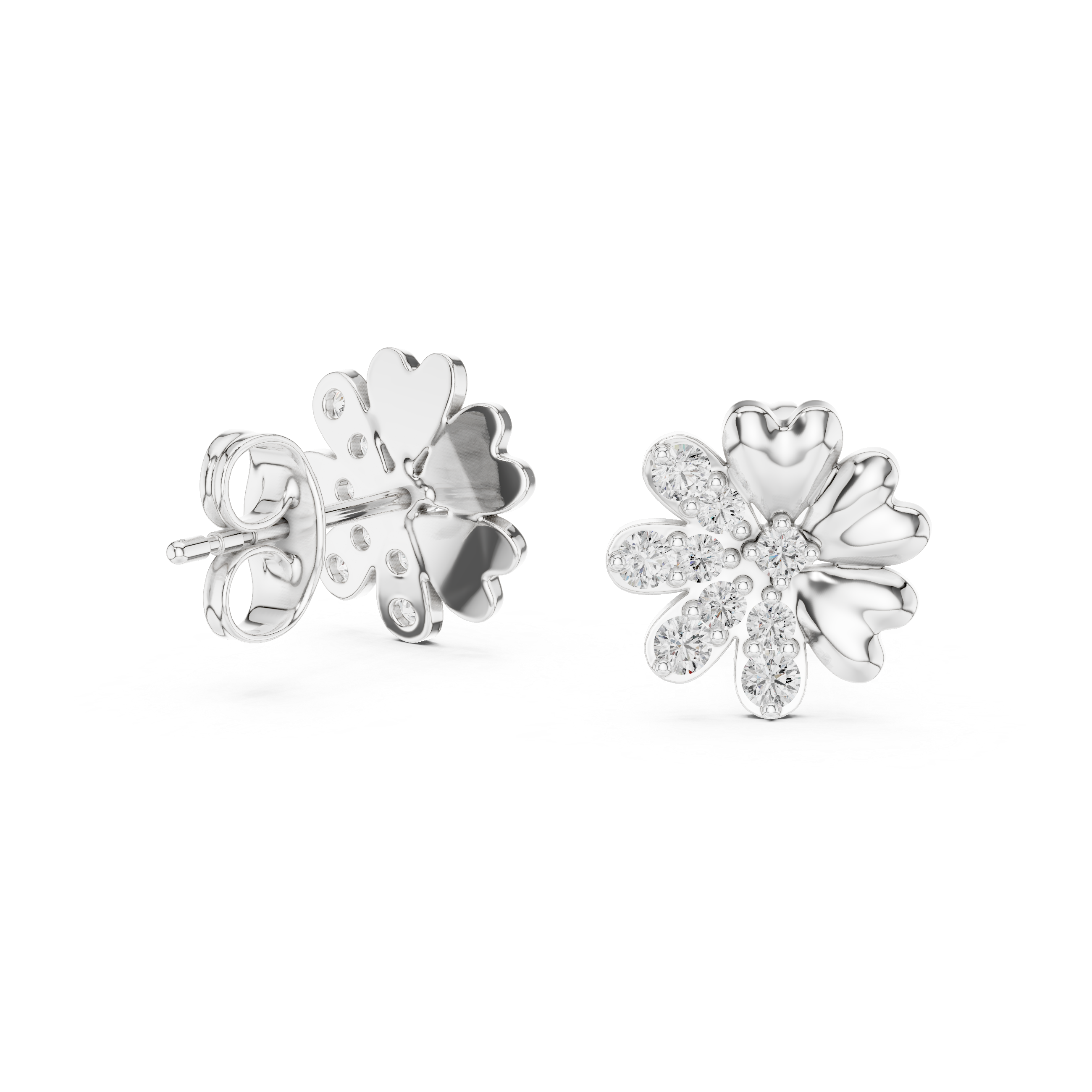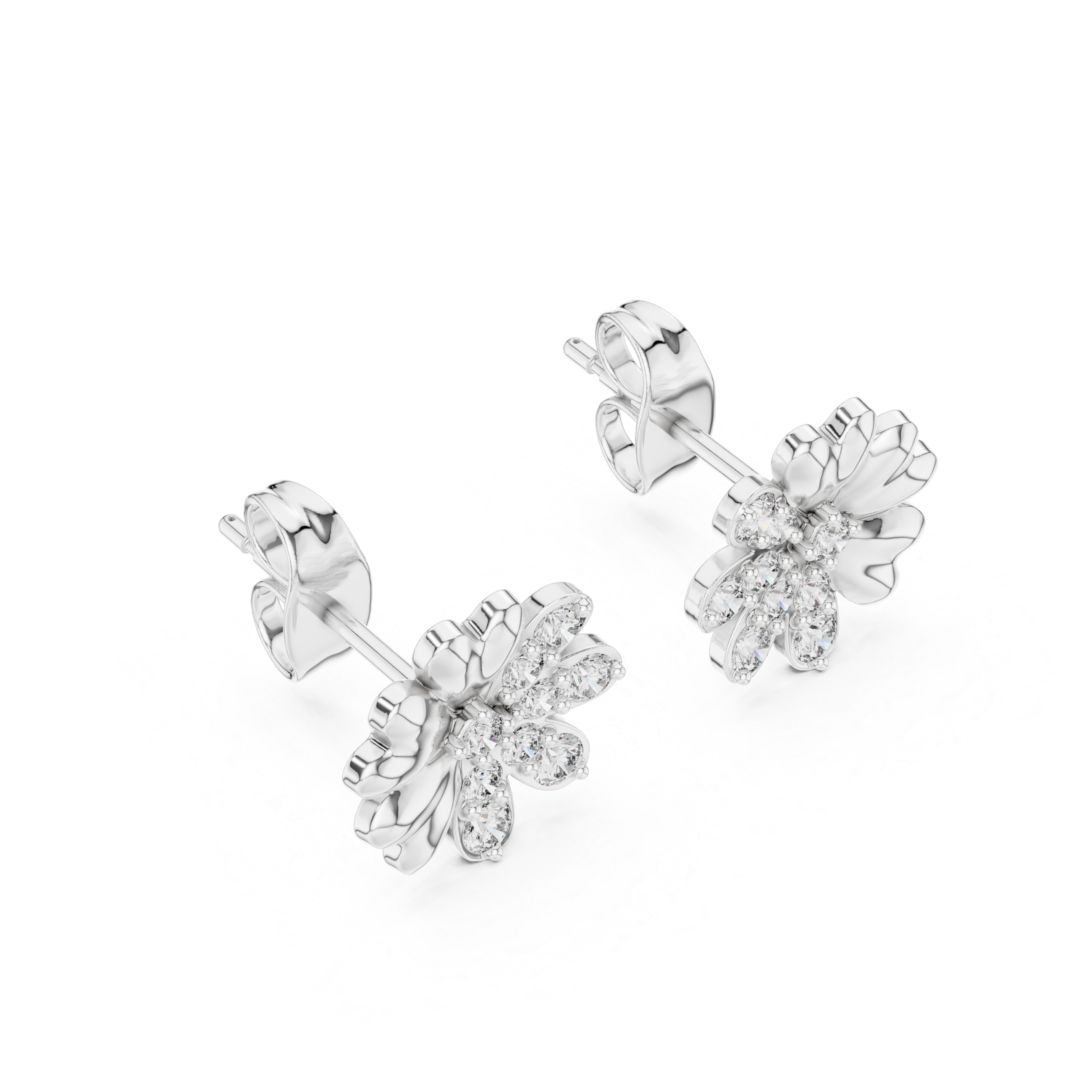 Inspired by blooming florals, these lab grown diamond stud earrings bring together softness, structure, and quiet brilliance. The design features sculpted gold petals with a gentle, organic flow, paired with diamond-set petals that add light and dimension to the form. At the center, a cluster of lab-grown diamonds anchors the design, creating a natural focal point that feels refined rather than ornate.