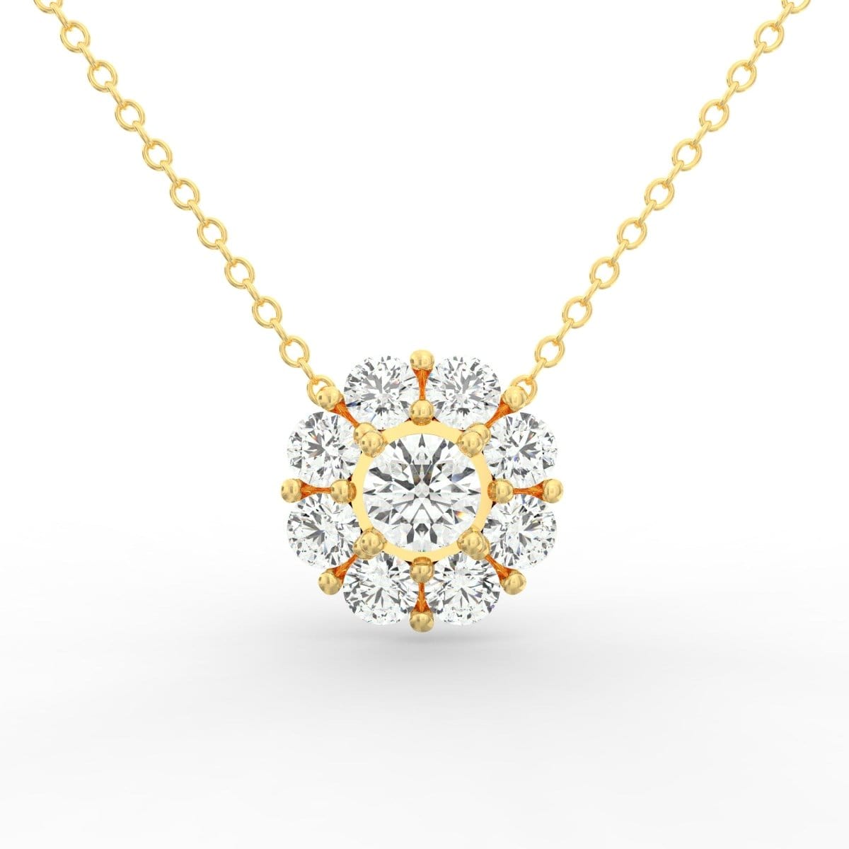Embark on a journey of ethereal beauty with our Round Diamond Solitaire Pendant, featuring a breathtaking solitaire diamond embraced by a delicate arrangement of round diamonds, each adorned with a unique touch of elegance—a glistening gold wire. At the heart of this pendant lies a mesmerizing solitaire diamond, meticulously cut to capture and reflect light with unmatched brilliance. The surrounding round diamonds, individually set, form a dazzling halo that accentuates the center stone's brilliance, while the delicate gold wires delicately connect each diamond, adding a distinctive charm and a touch of artistry to the design.