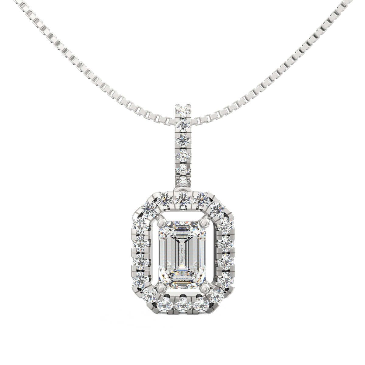 This lab grown diamond pendant is a refined tribute to elegance and symmetry. The Elara Pendant showcases a radiant 0.75 carat emerald-cut lab grown diamond, placed at the center of a sleek halo. Around it, round diamonds form a glowing frame that adds light and depth.