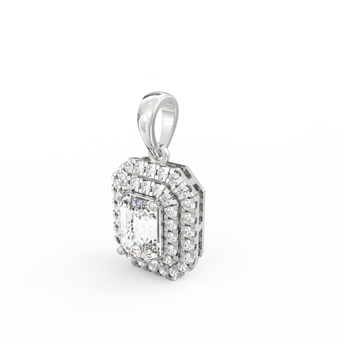 This lab grown diamond pendant offers both power and polish. The Royale Solitaire Pendant features a brilliant 1.00 ct emerald-cut diamond, carefully framed by dual rows of round lab grown diamonds. Together, they shine with clarity and symmetry.
