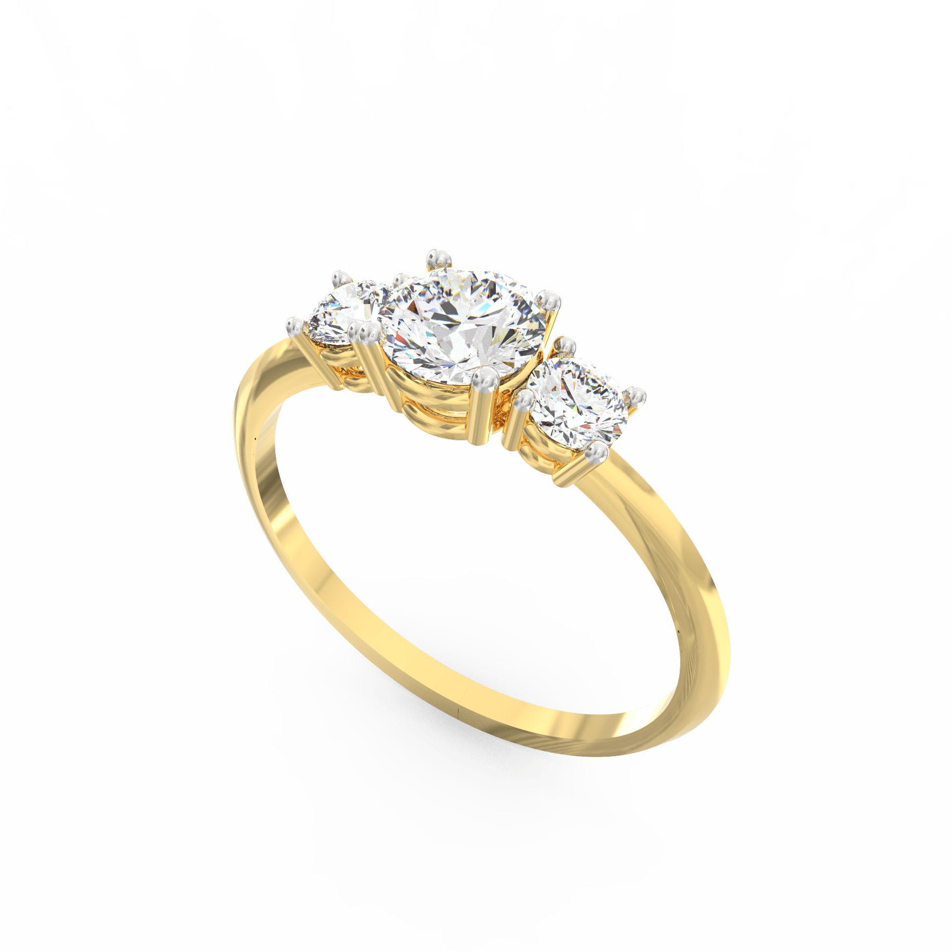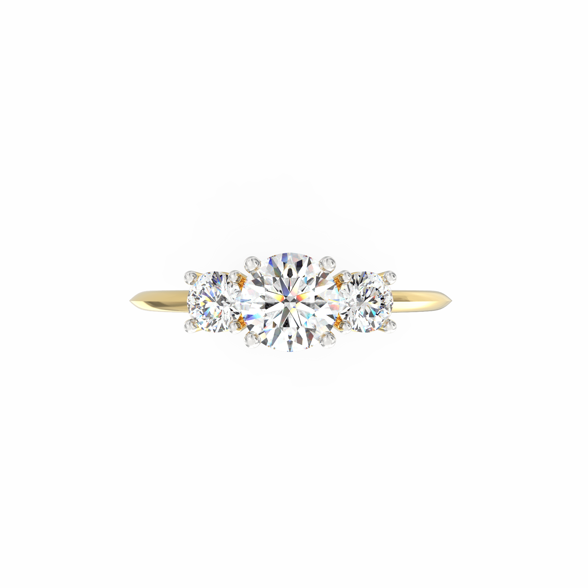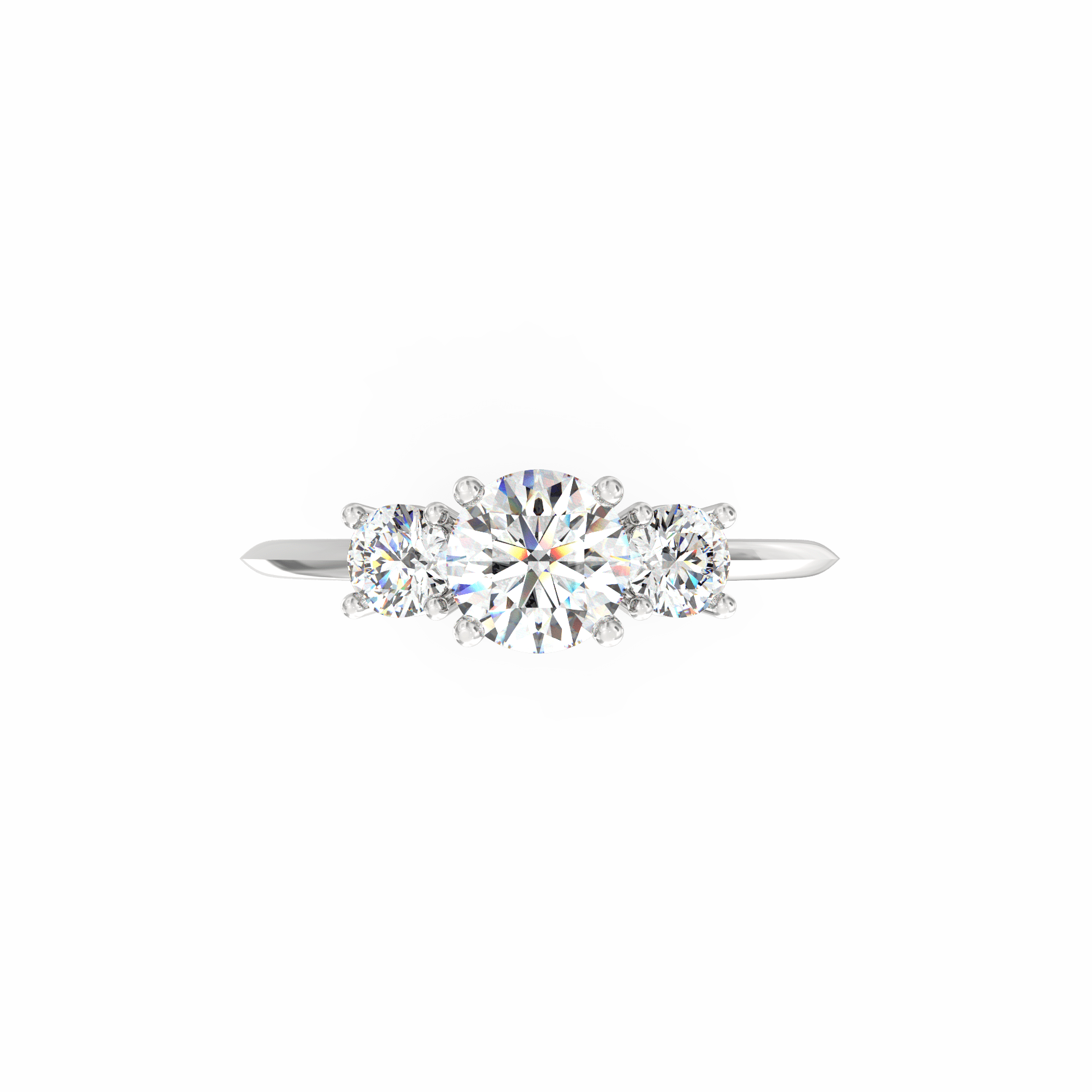 The central Round cut diamond is meticulously selected for its exceptional sparkle and clarity, radiating brilliance from every angle. It is complemented by two equally dazzling Round cut diamonds, carefully positioned to enhance the overall beauty of the ring.
