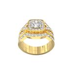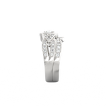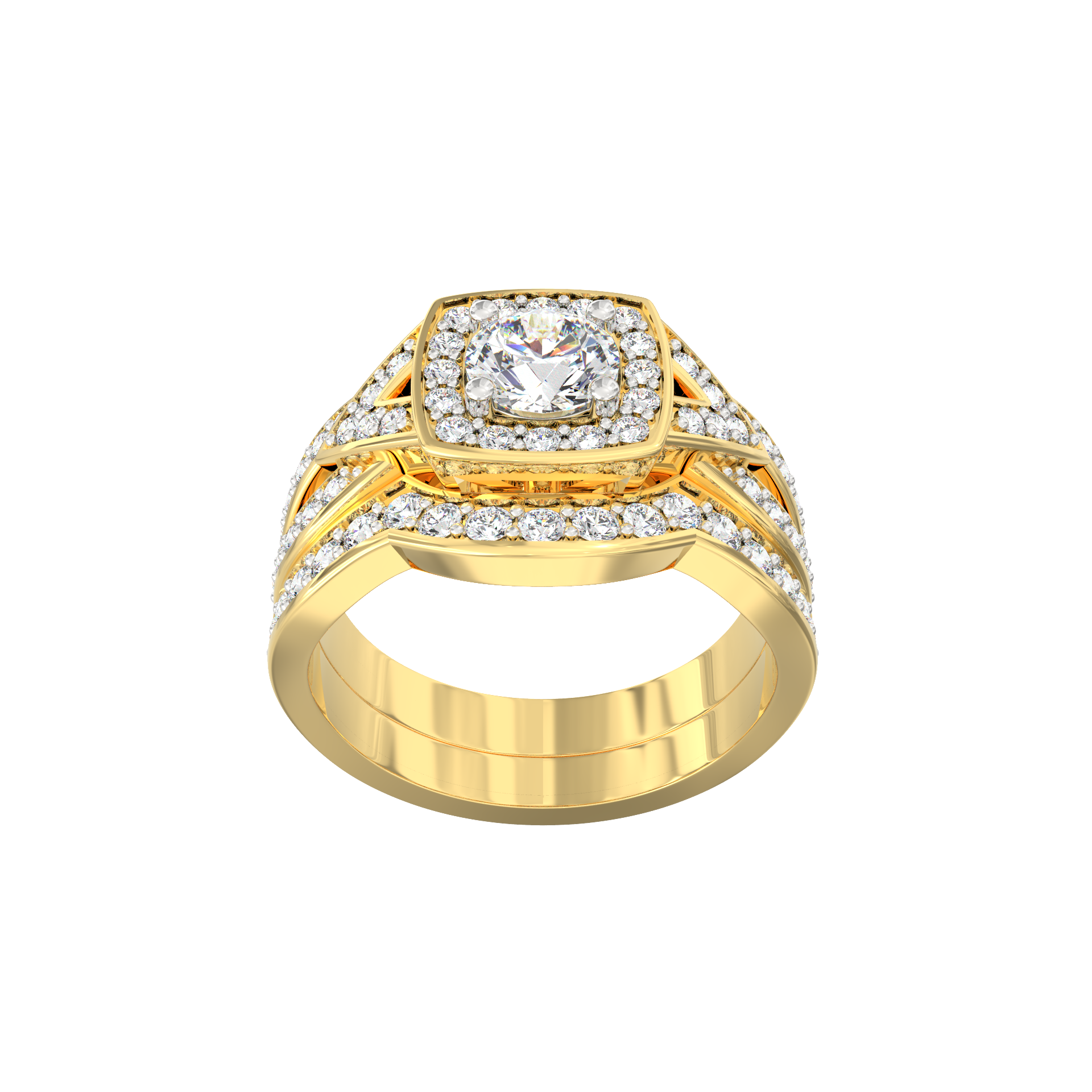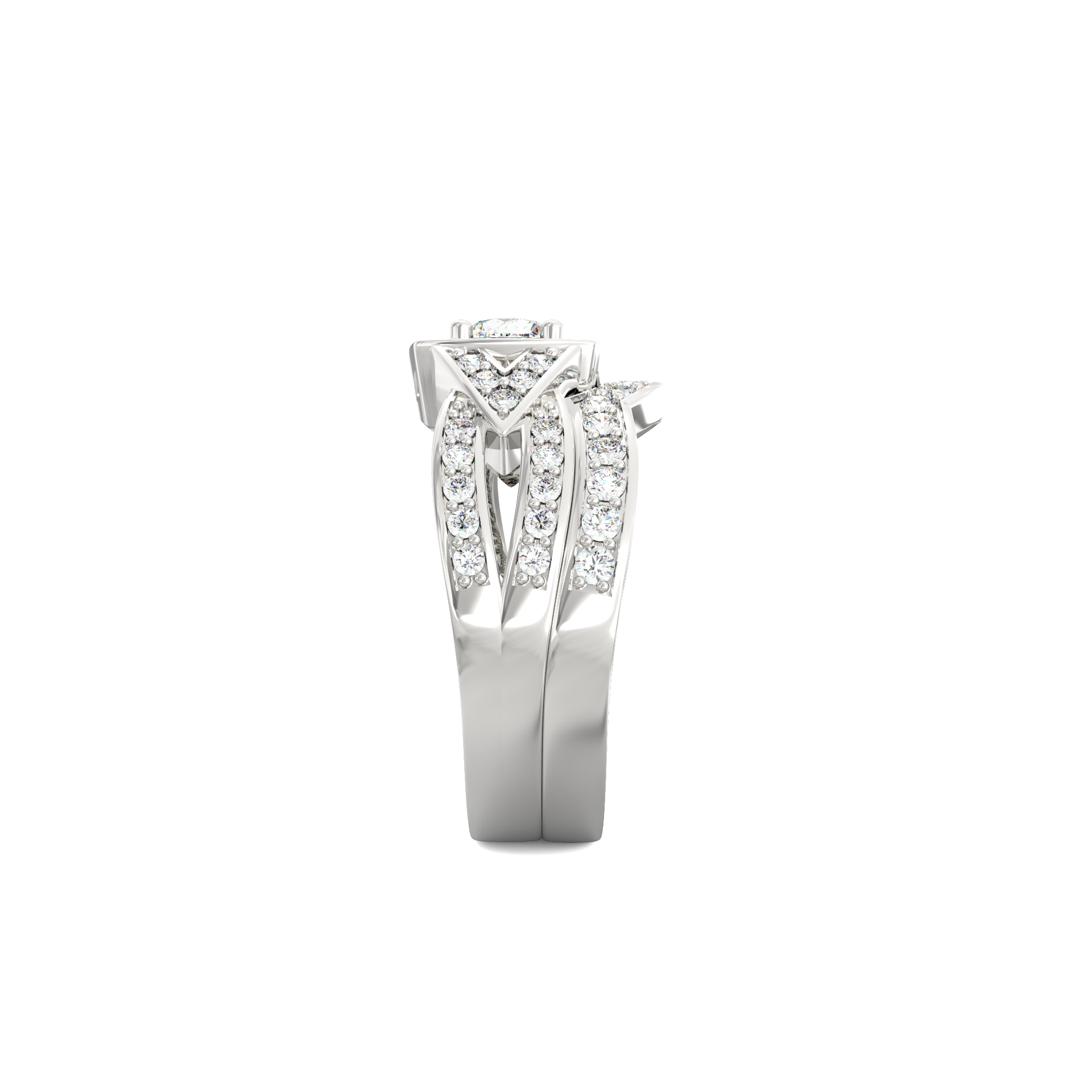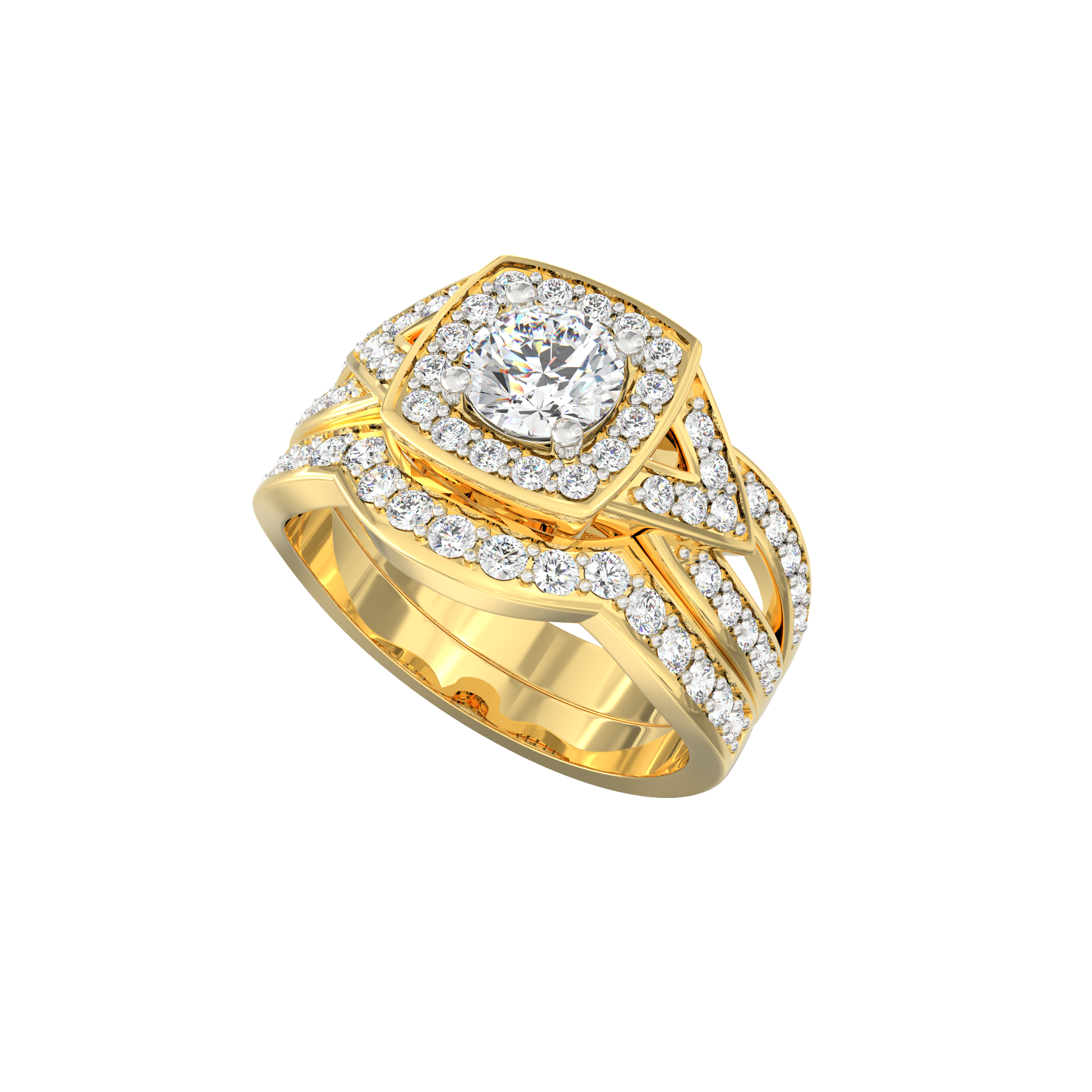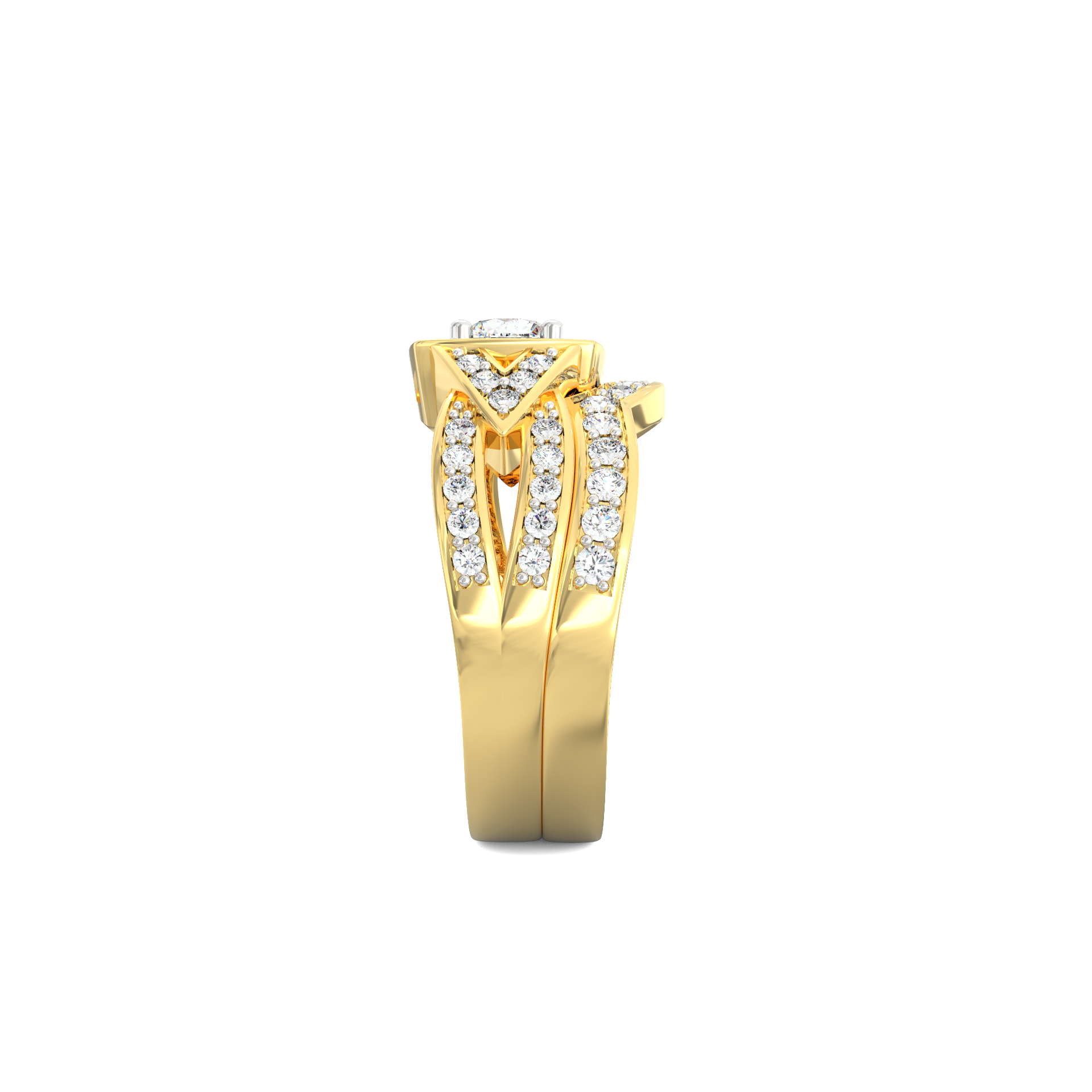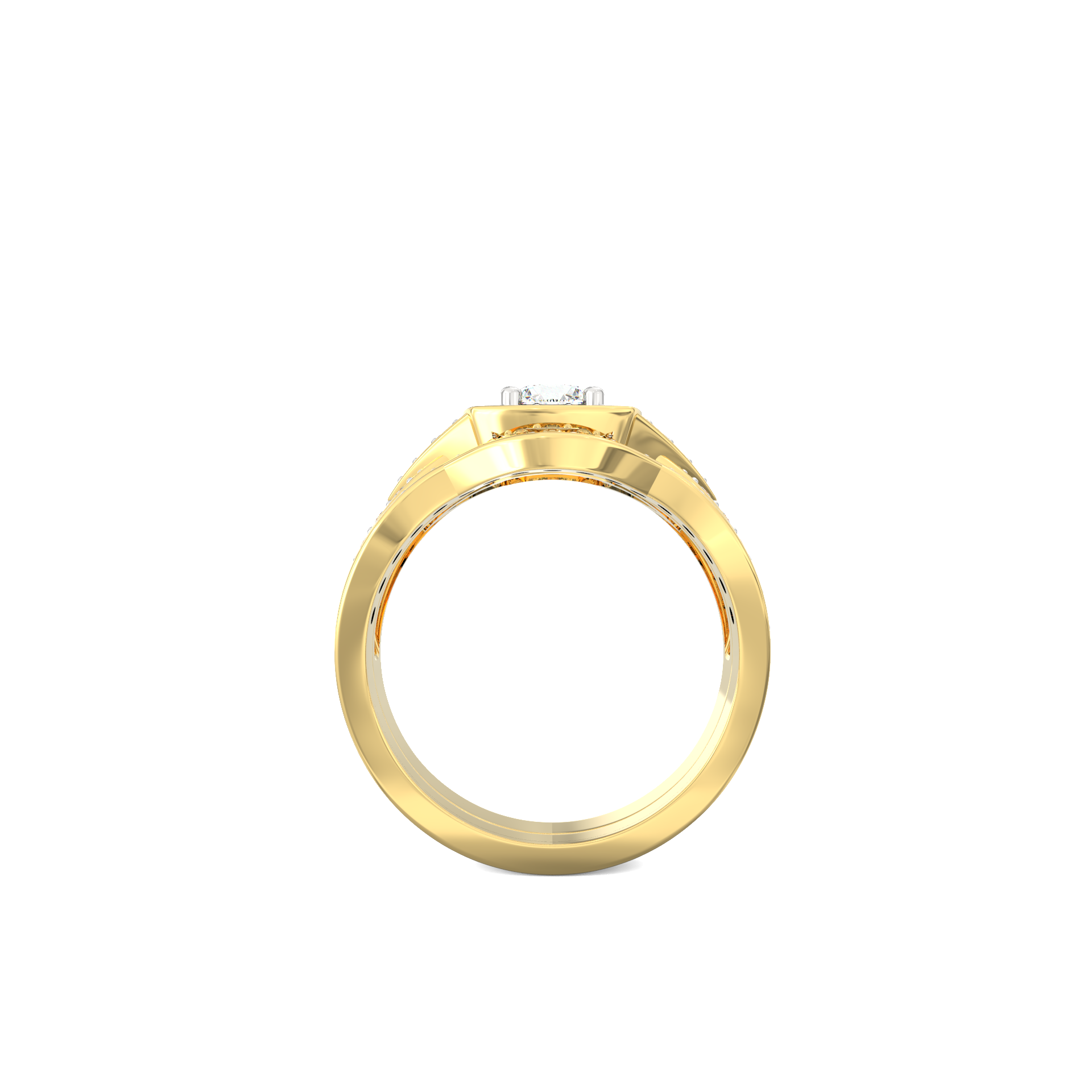 The split shank design adds a sculptural element, giving the ring a balanced yet striking outline. Crafted in BIS Hallmarked Gold, the band supports the setting with smooth contours that enhance comfort and durability. Each diamond carries VS2+ clarity and G+ color, ensuring a consistent, refined sparkle across the entire ring.