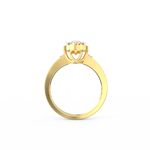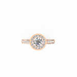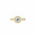 Wear Auretta with soft rose, pastel, or neutral tones to highlight its warm details. It pairs well with thin diamond bands if you prefer a bridal stack, or you can wear it solo for a focused, radiant look. Simple studs or a fine pendant complete the ensemble beautifully.