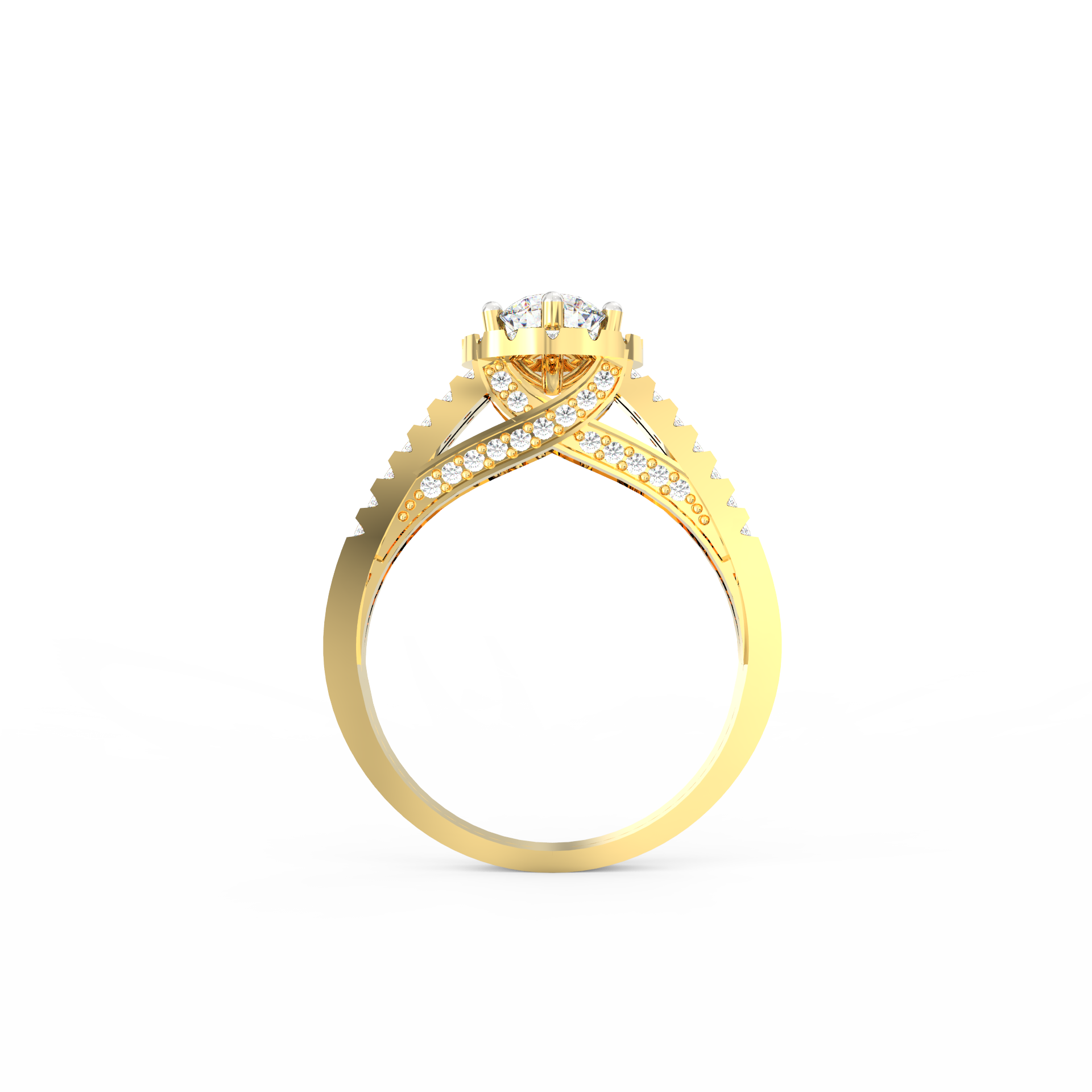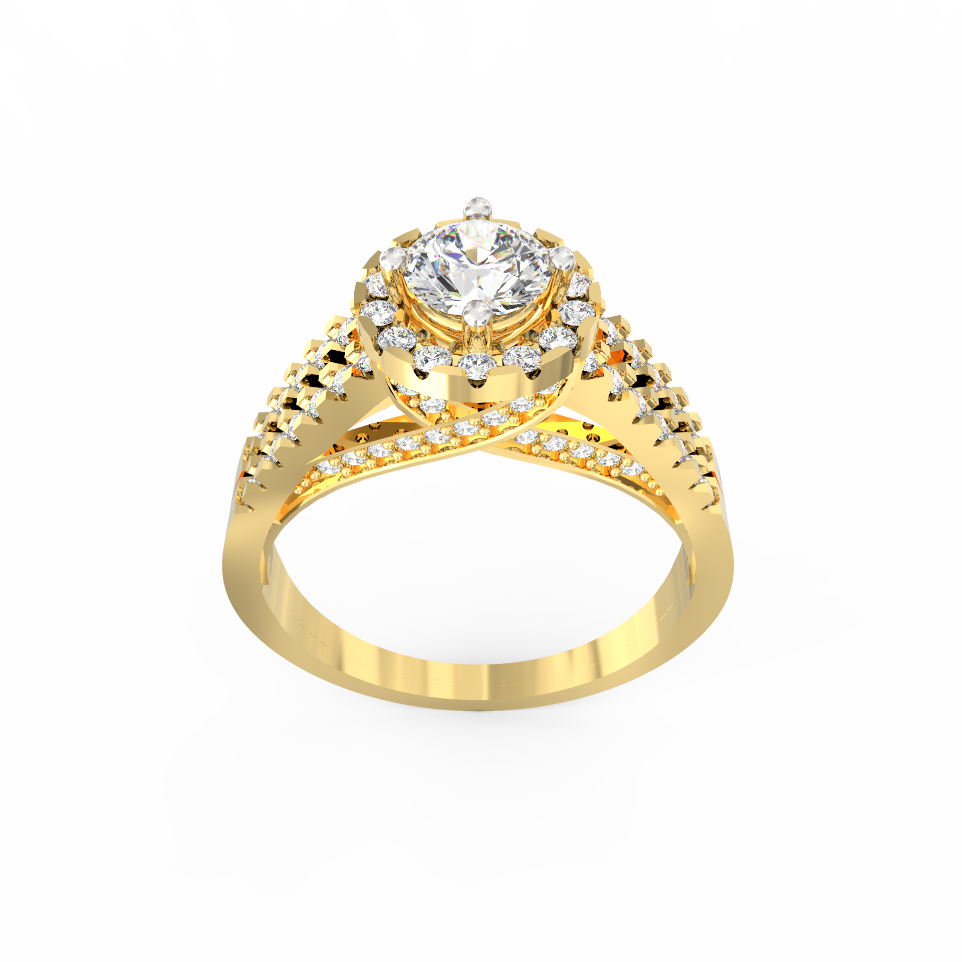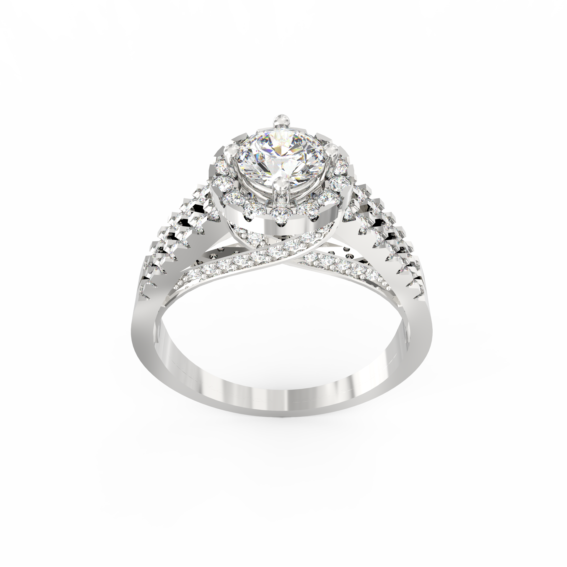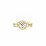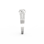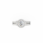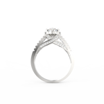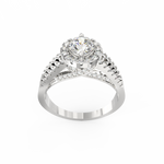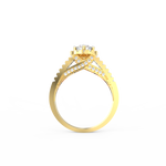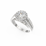 A halo of 74 accent diamonds encircles the centerpiece, bringing a soft yet vivid glow to the ring. These smaller stones, totaling 0.54 Ct, continue along the split shank, creating motion and depth. As the light moves across the ring, every angle reveals a new layer of sparkle. Because the band opens into two lines, the design feels airy while still offering a bold presence.