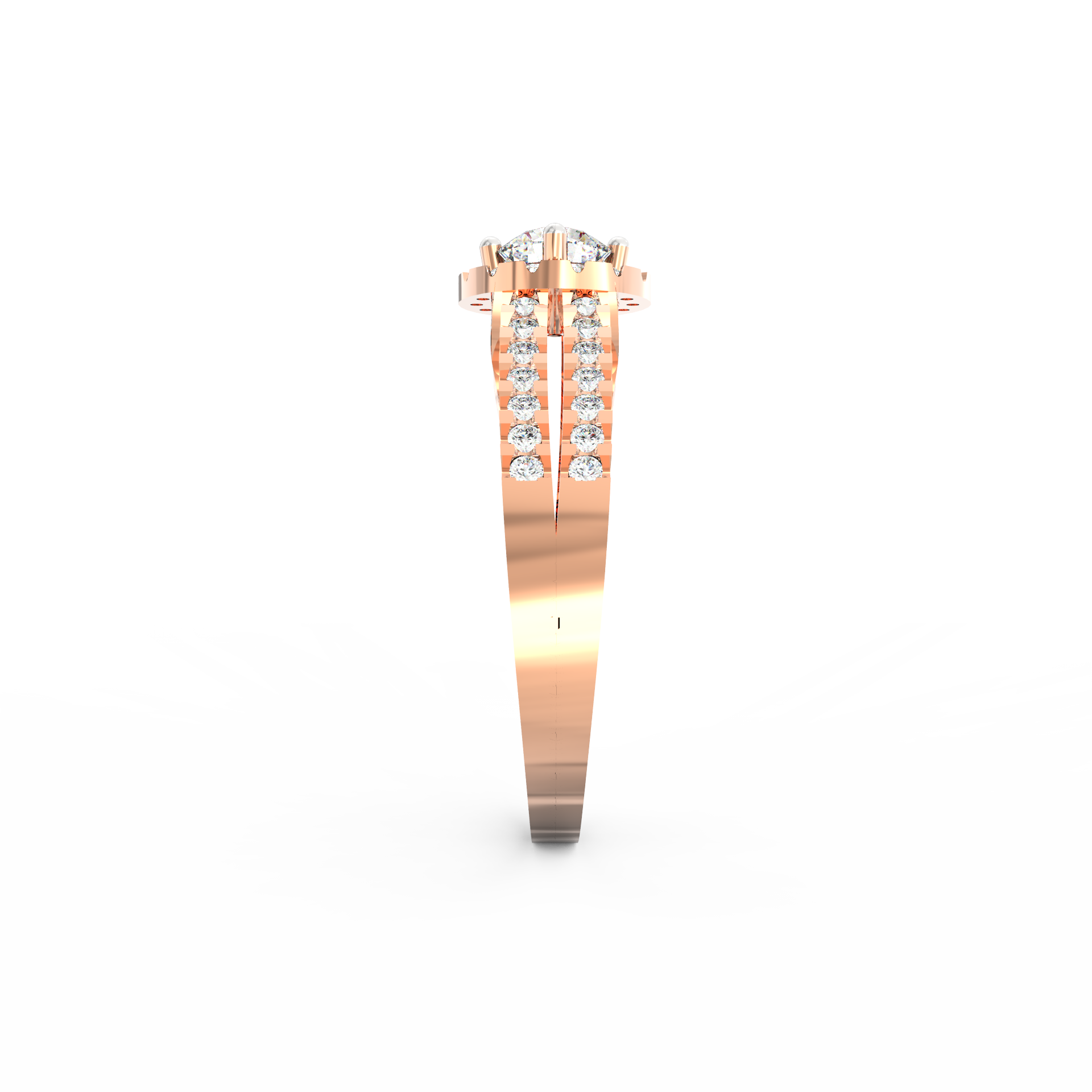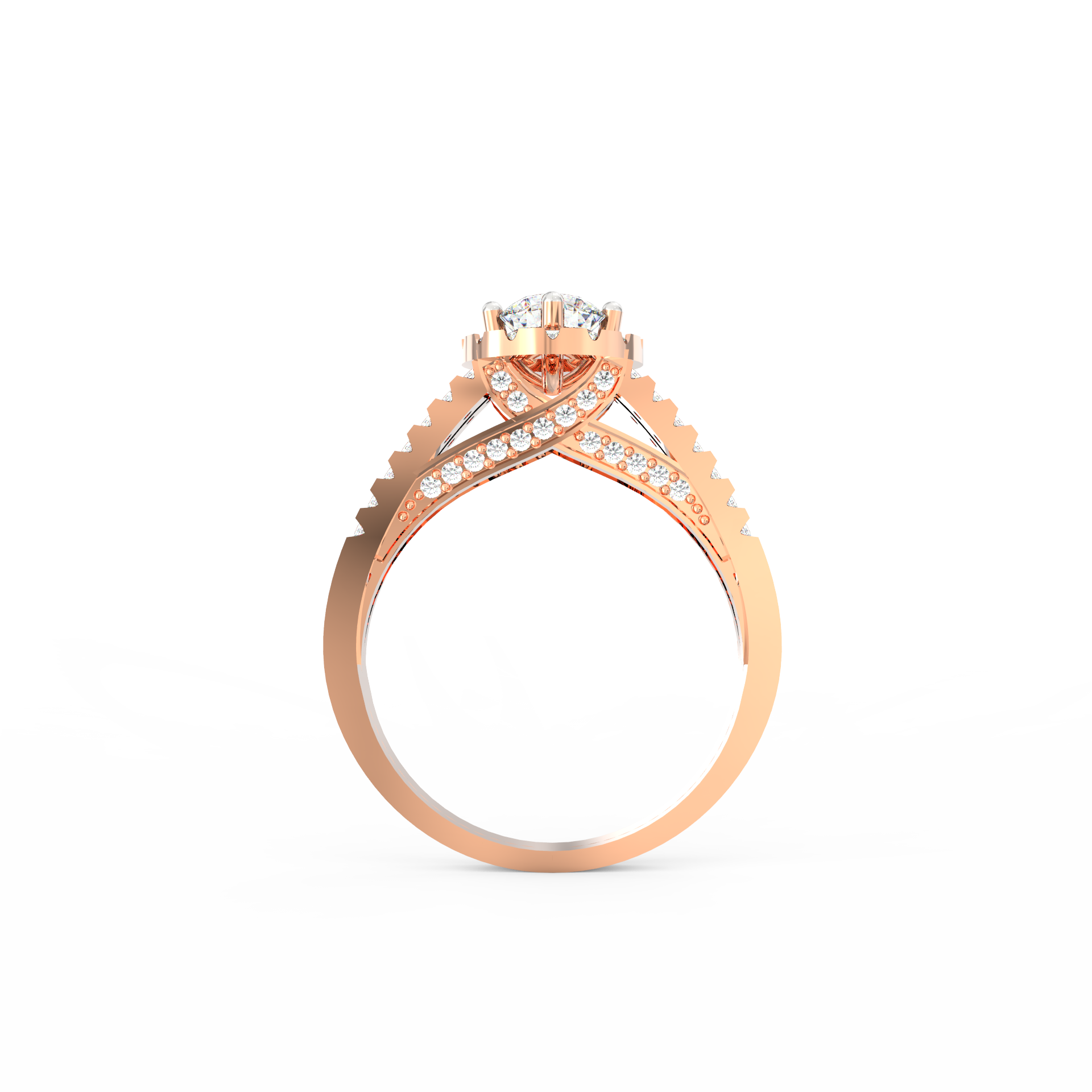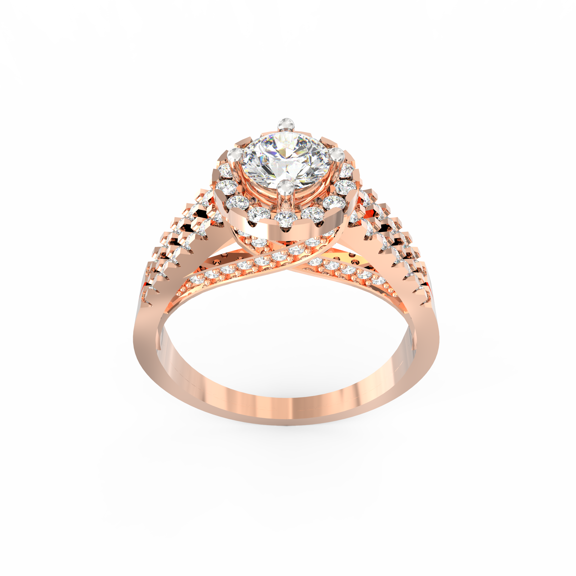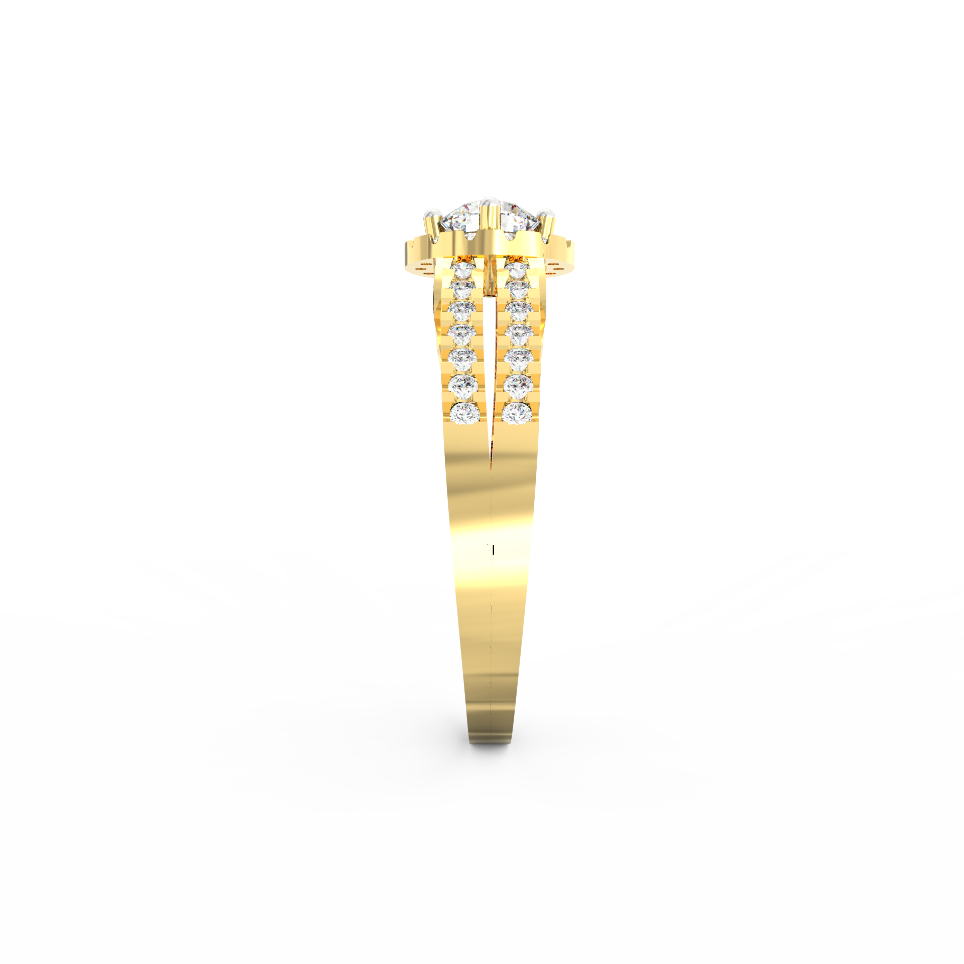 A halo of 74 accent diamonds encircles the centerpiece, bringing a soft yet vivid glow to the ring. These smaller stones, totaling 0.54 Ct, continue along the split shank, creating motion and depth. As the light moves across the ring, every angle reveals a new layer of sparkle. Because the band opens into two lines, the design feels airy while still offering a bold presence.