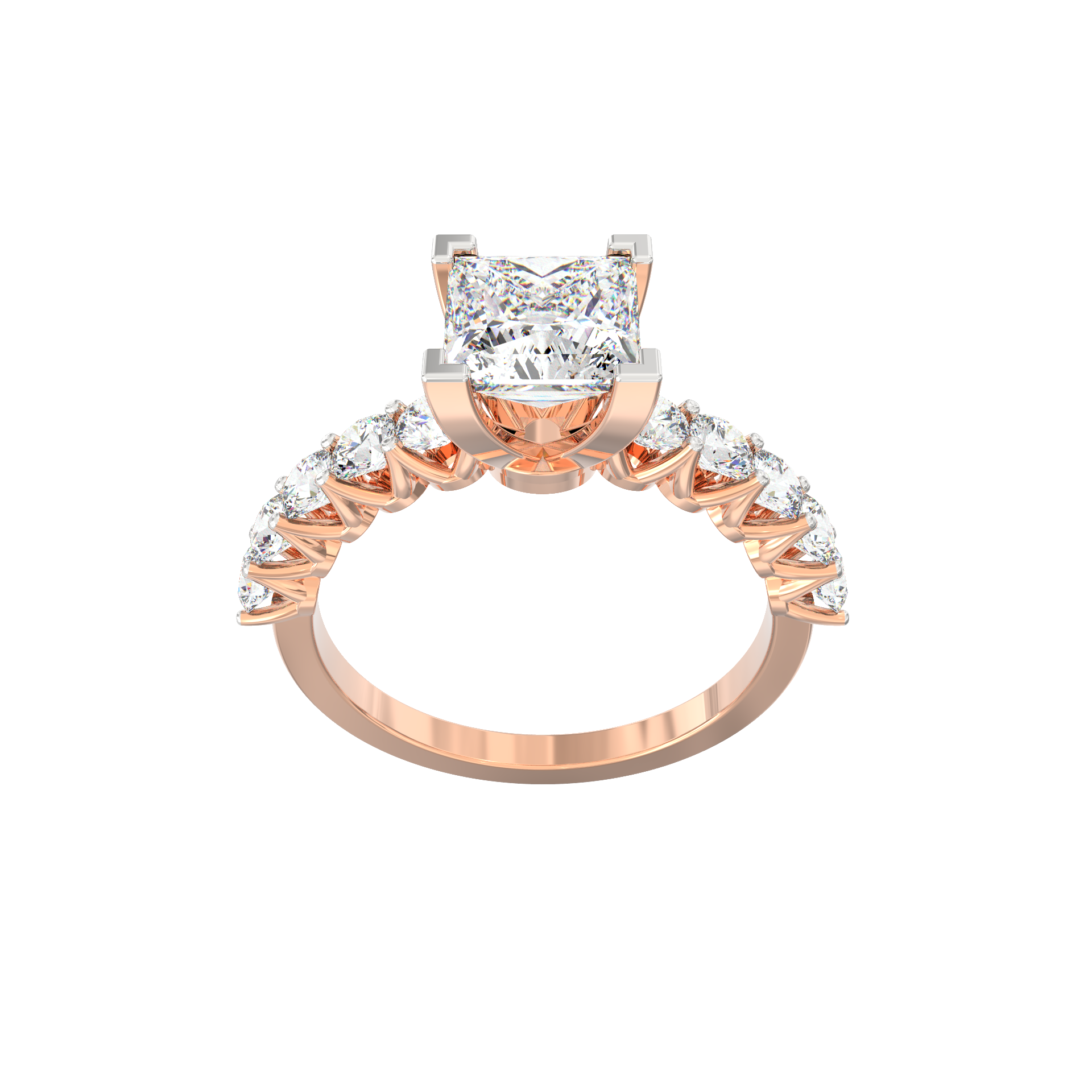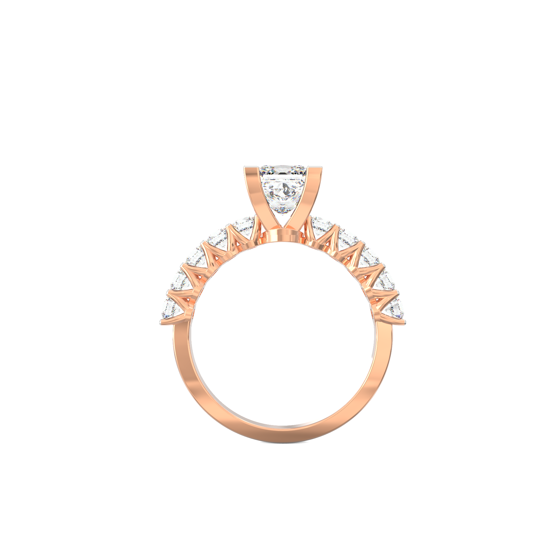 Along the band, ten round-cut diamonds totaling 0.80 Ct add a steady sparkle. Their smooth arrangement creates a balanced design that shines from every angle. Because the band remains sleek and easy to wear, the ring transitions well from daily moments to special occasions. Each diamond features VS2+ clarity and G+ color, offering a refined look that feels both expressive and graceful.