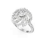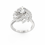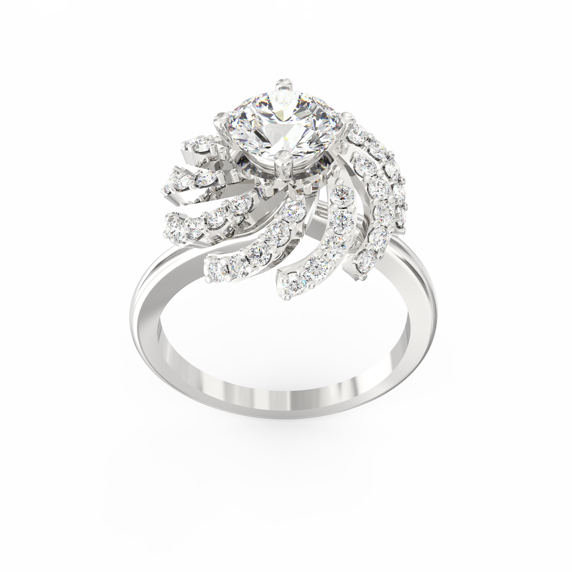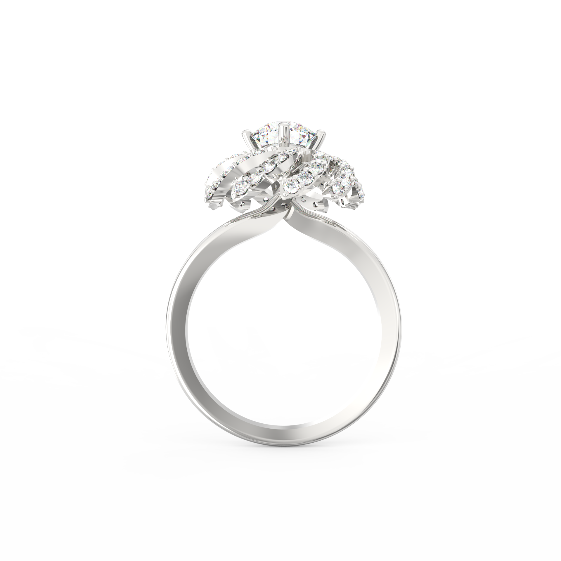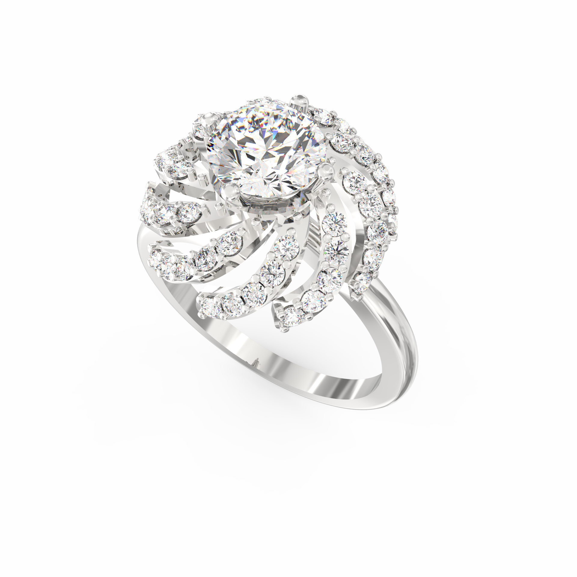 The Vortice lab grown diamond swirl ring brings together movement, form, and modern style. Inspired by the Italian word “Vortice,” meaning whirlwind, the design captures the feeling of flow and energy. At the center sits a 0.75 Ct round-cut lab-grown diamond that shines with clarity and structure. Surrounding it, 50 smaller diamonds trace an expressive swirl, forming a pattern that looks alive with motion. Each stone reflects light in a clean and steady rhythm, adding depth and character to the piece.
