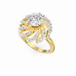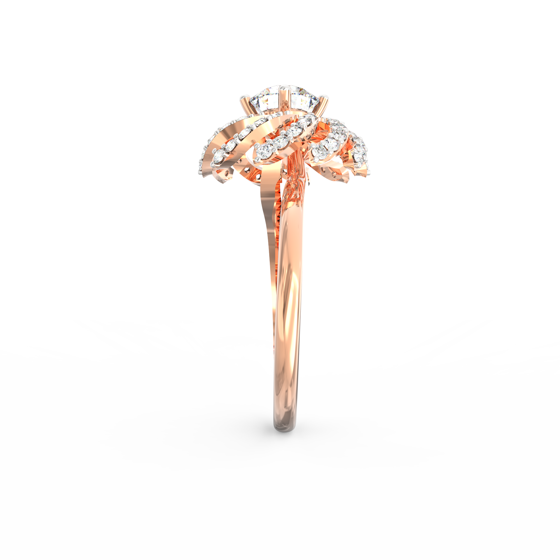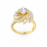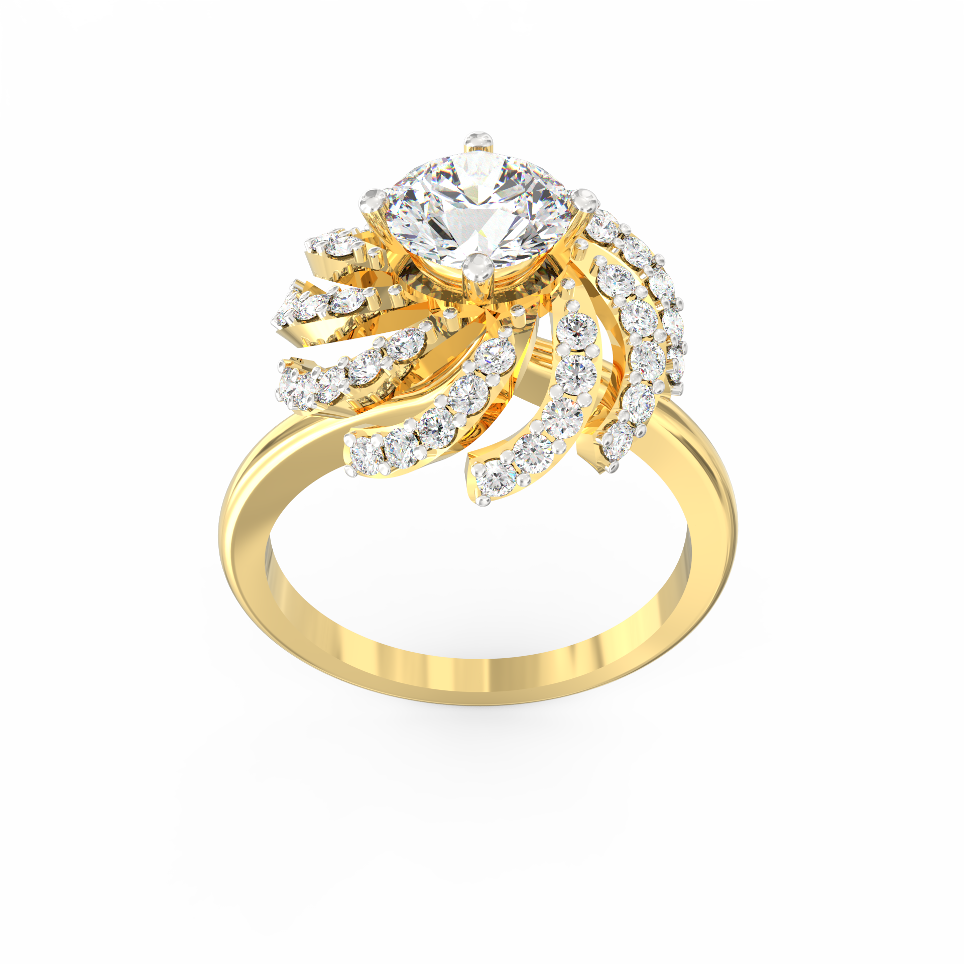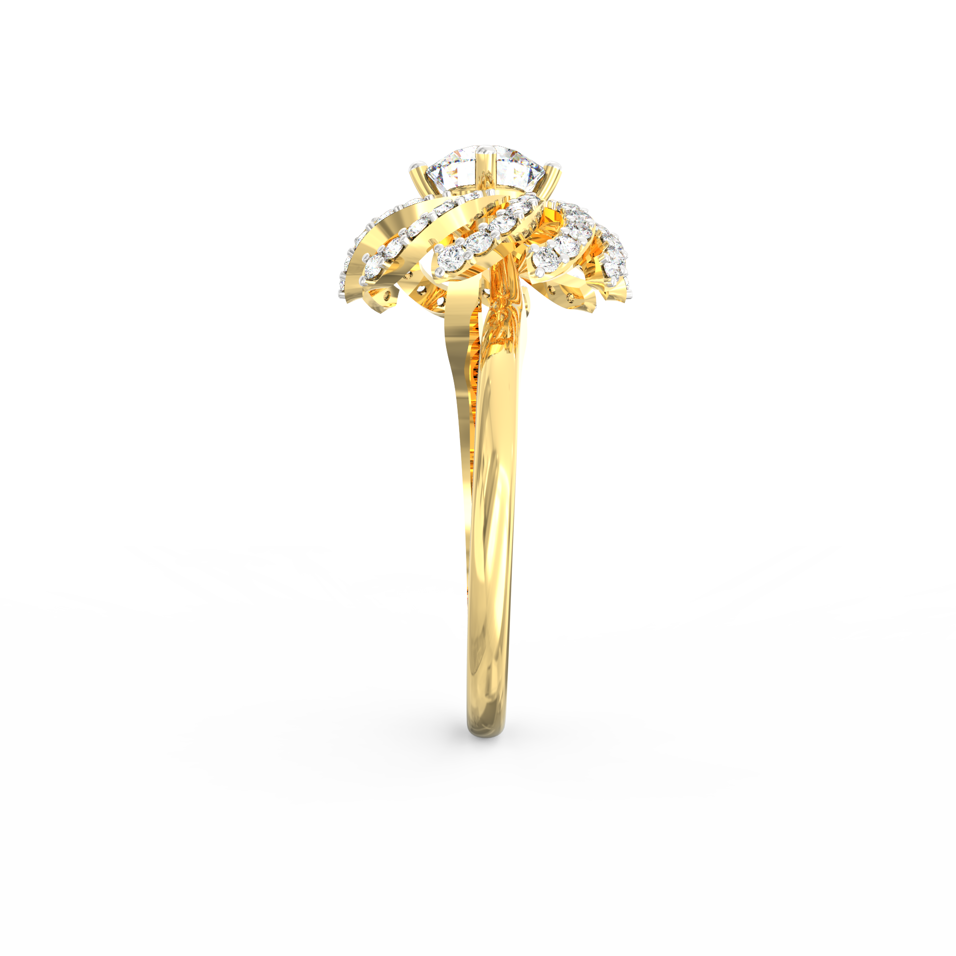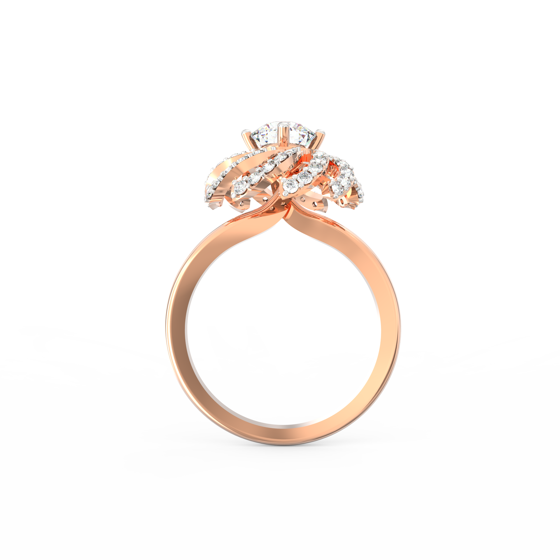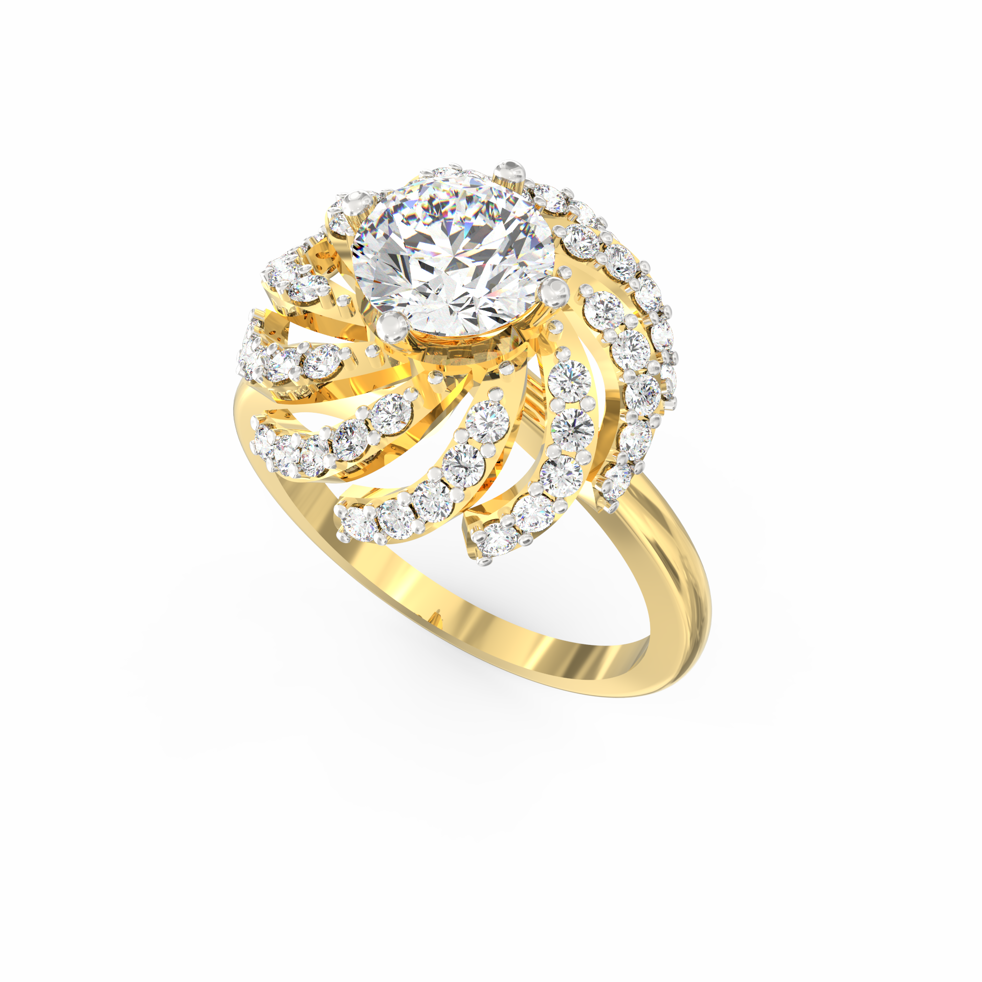 Crafted in BIS Hallmarked Gold, the ring blends sculptural artistry with contemporary appeal. The swirl creates a soft spiral that draws the eye inward, making the center diamond stand out even more. VS2+ clarity and G+ color ensure every stone remains bright and consistent, while the setting supports the diamonds with balance and strength. As a result, the ring feels bold but still easy to wear every day.