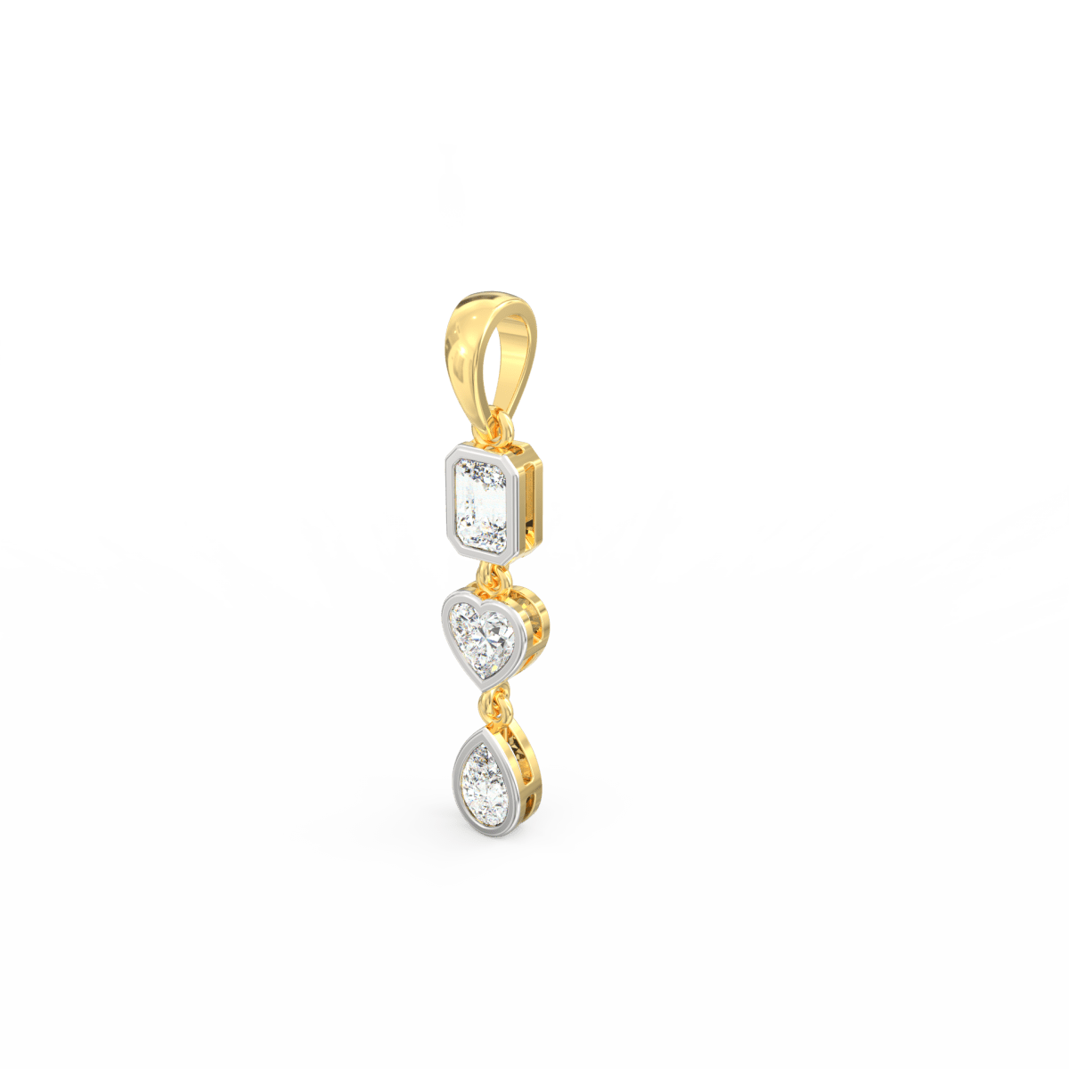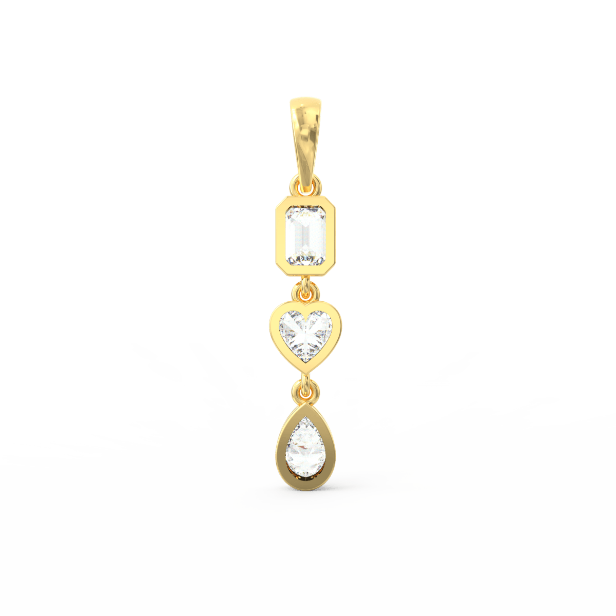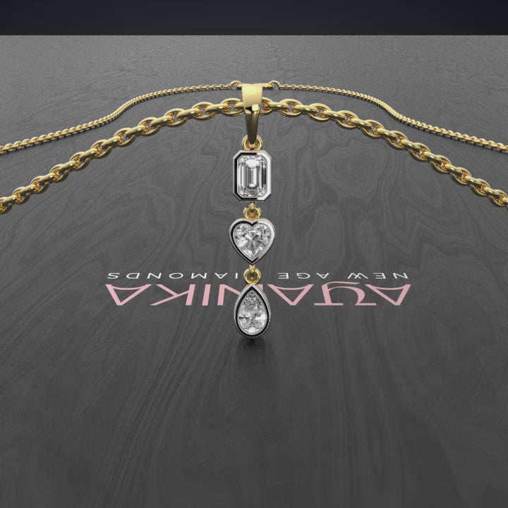 This love-themed pendant showcases an emerald-cut diamond, a heart-shaped diamond, and a pear-shaped diamond. Each stone reflects a different sentiment—strength, affection, and hope. The bezel setting enhances the clean design while keeping every diamond secure. As a result, the pendant carries both visual harmony and emotional depth.