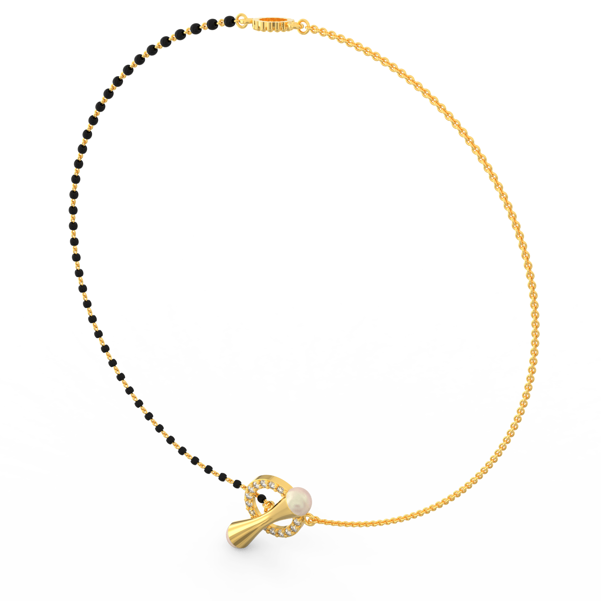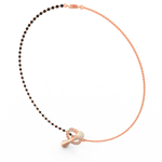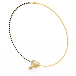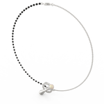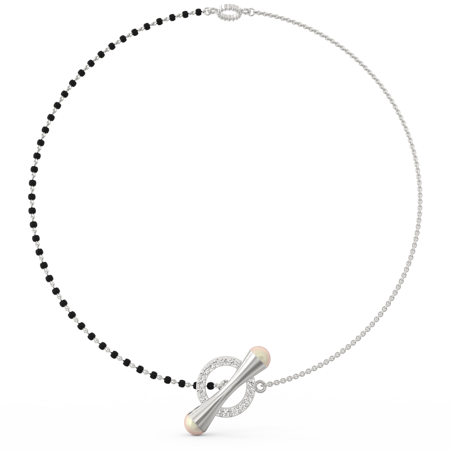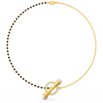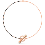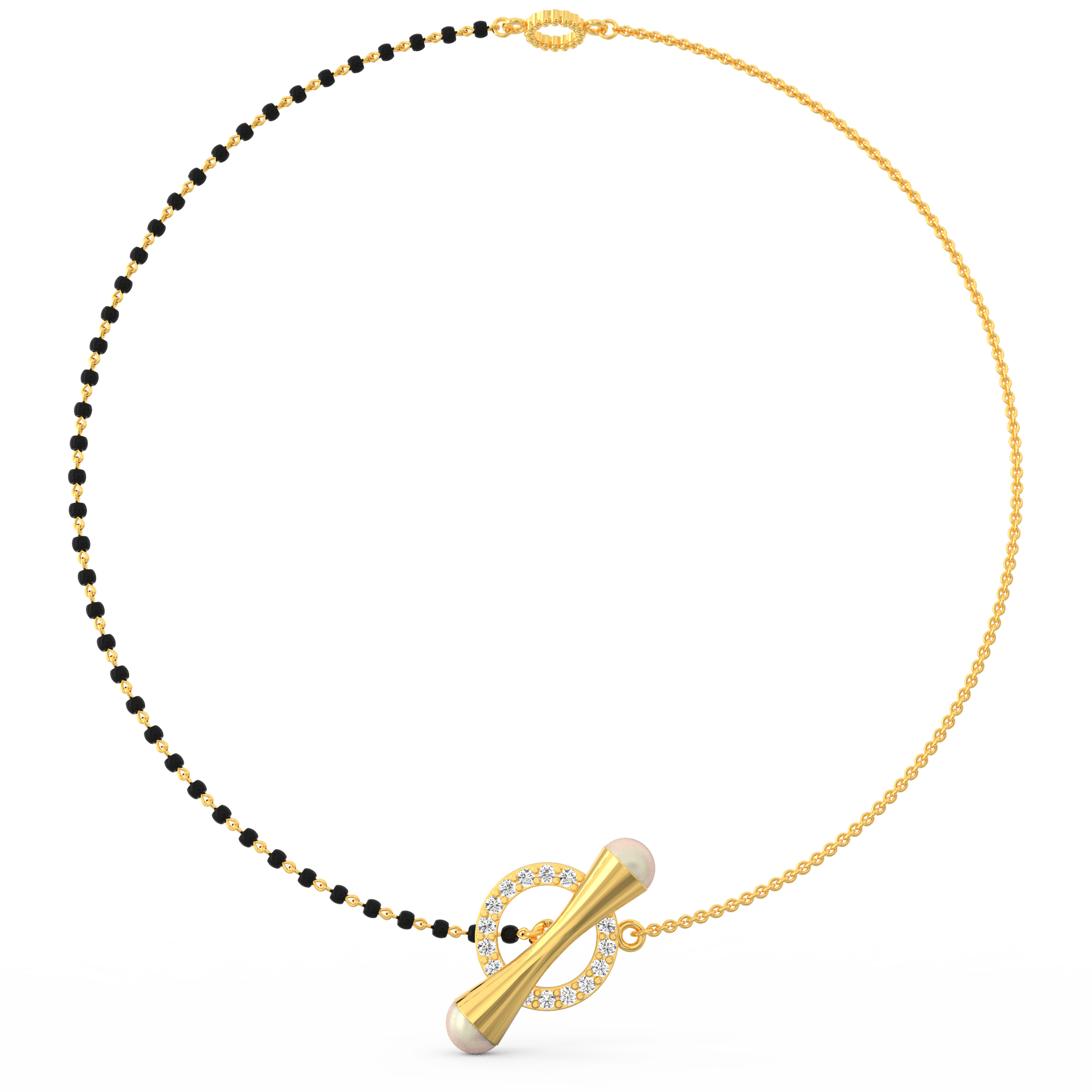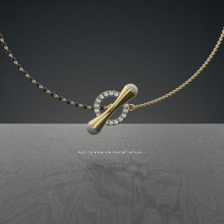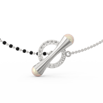 Bold yet graceful, this mangalsutra bracelet takes a modern approach with its toggle-inspired centerpiece. The cylindrical bar with rounded pearl tips elegantly passes through a circular diamond-studded loop, adding a subtle sense of movement to the piece. The contemporary geometry of the design is balanced by the traditional dual-chain—half with black beads, half with a plain link—for a look that merges heritage with high fashion.
