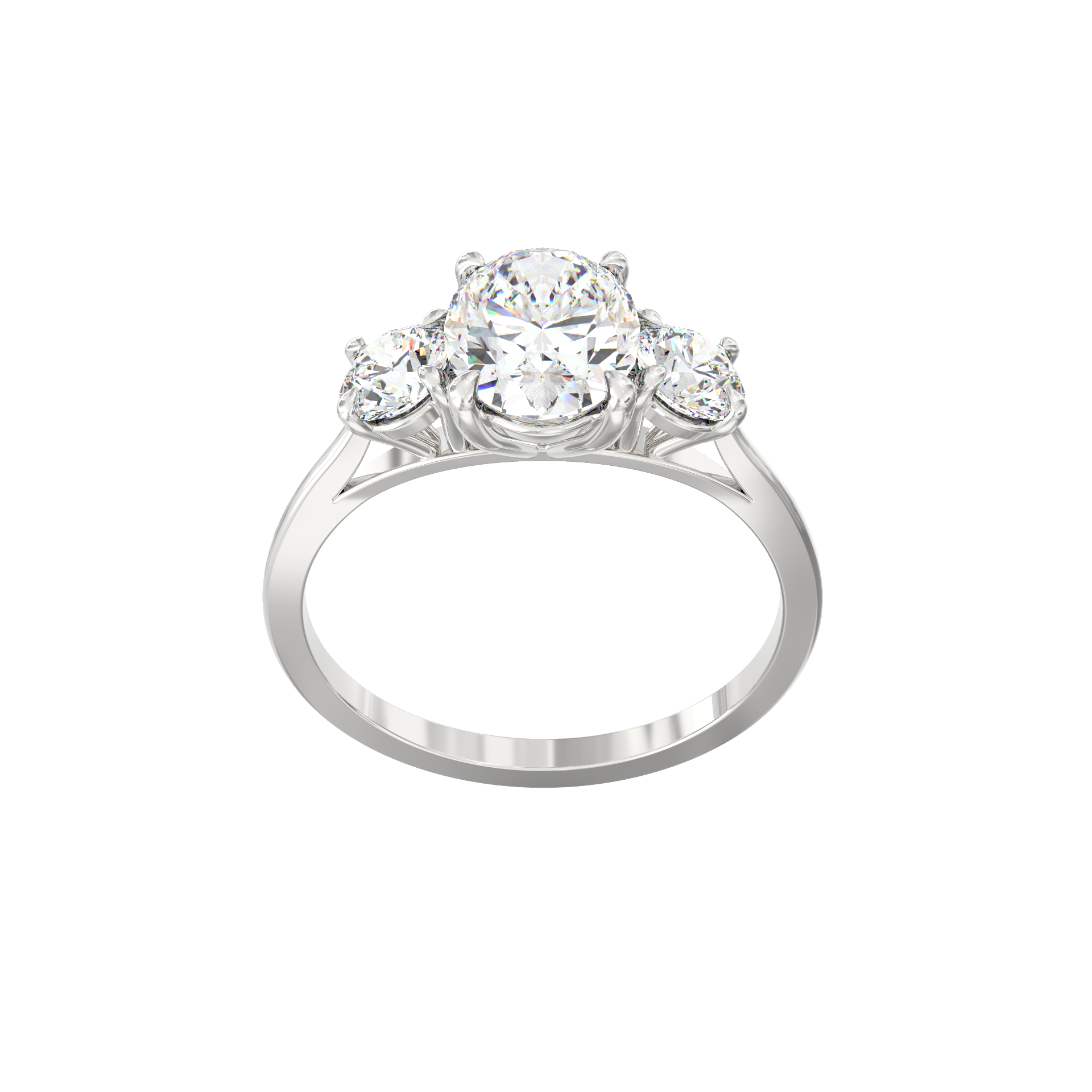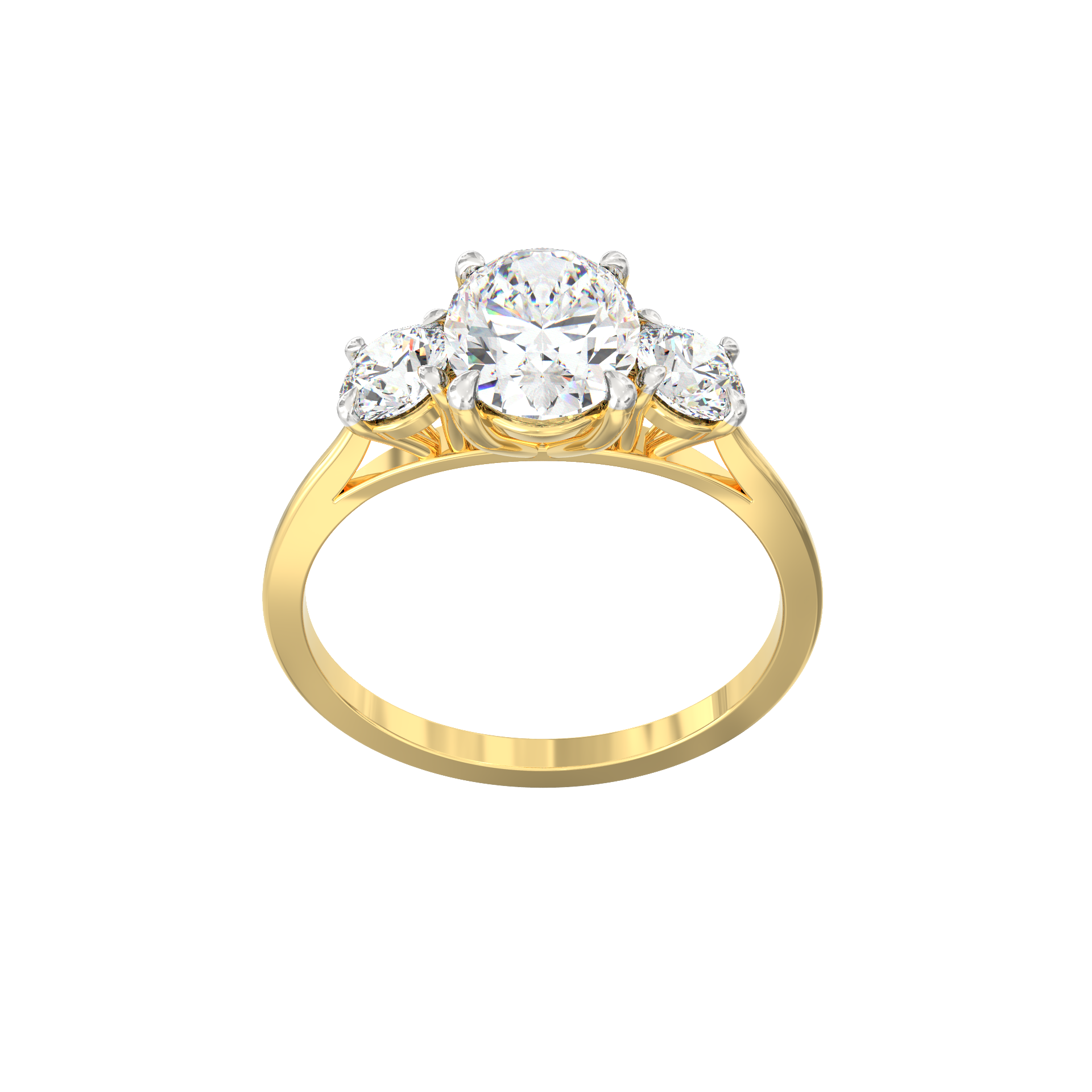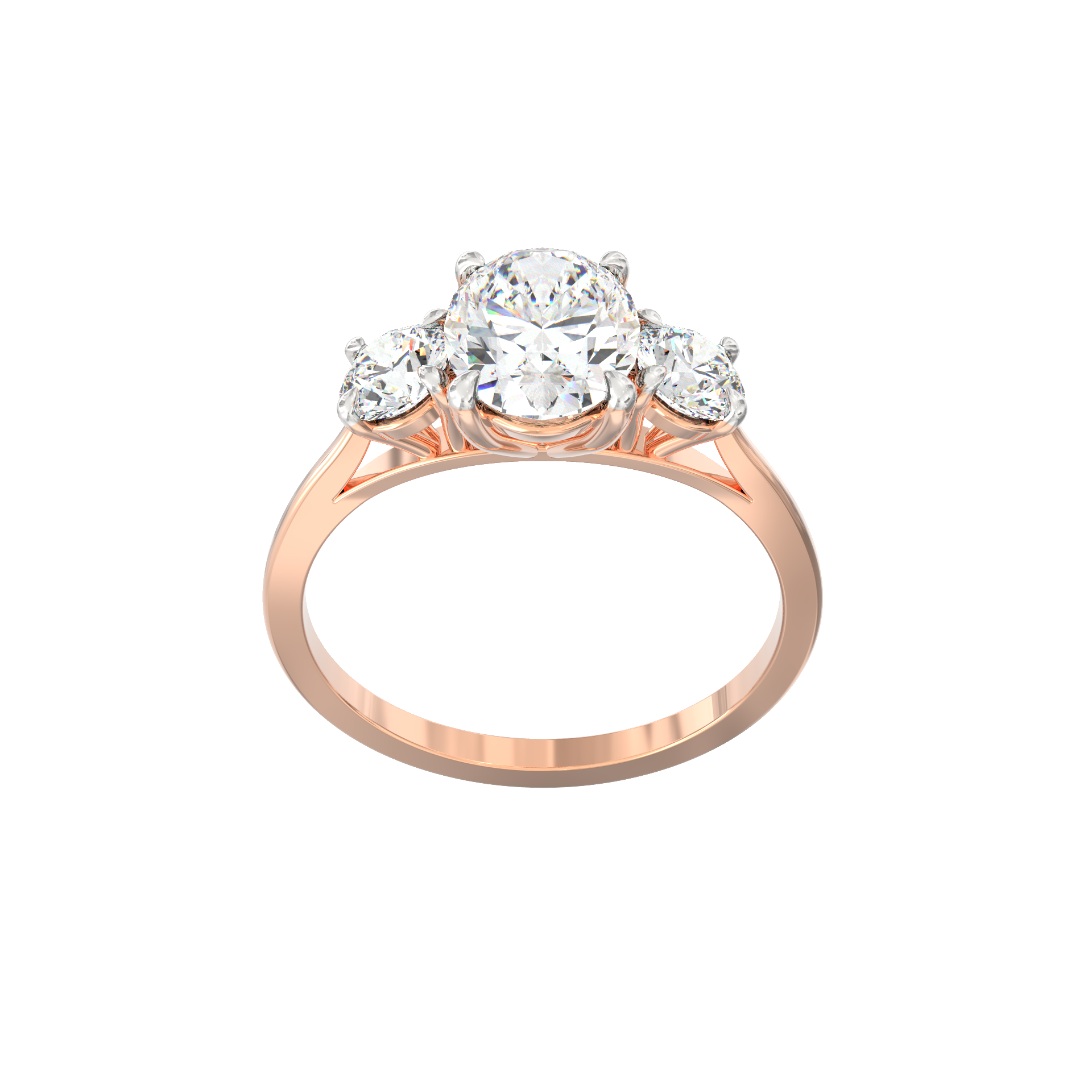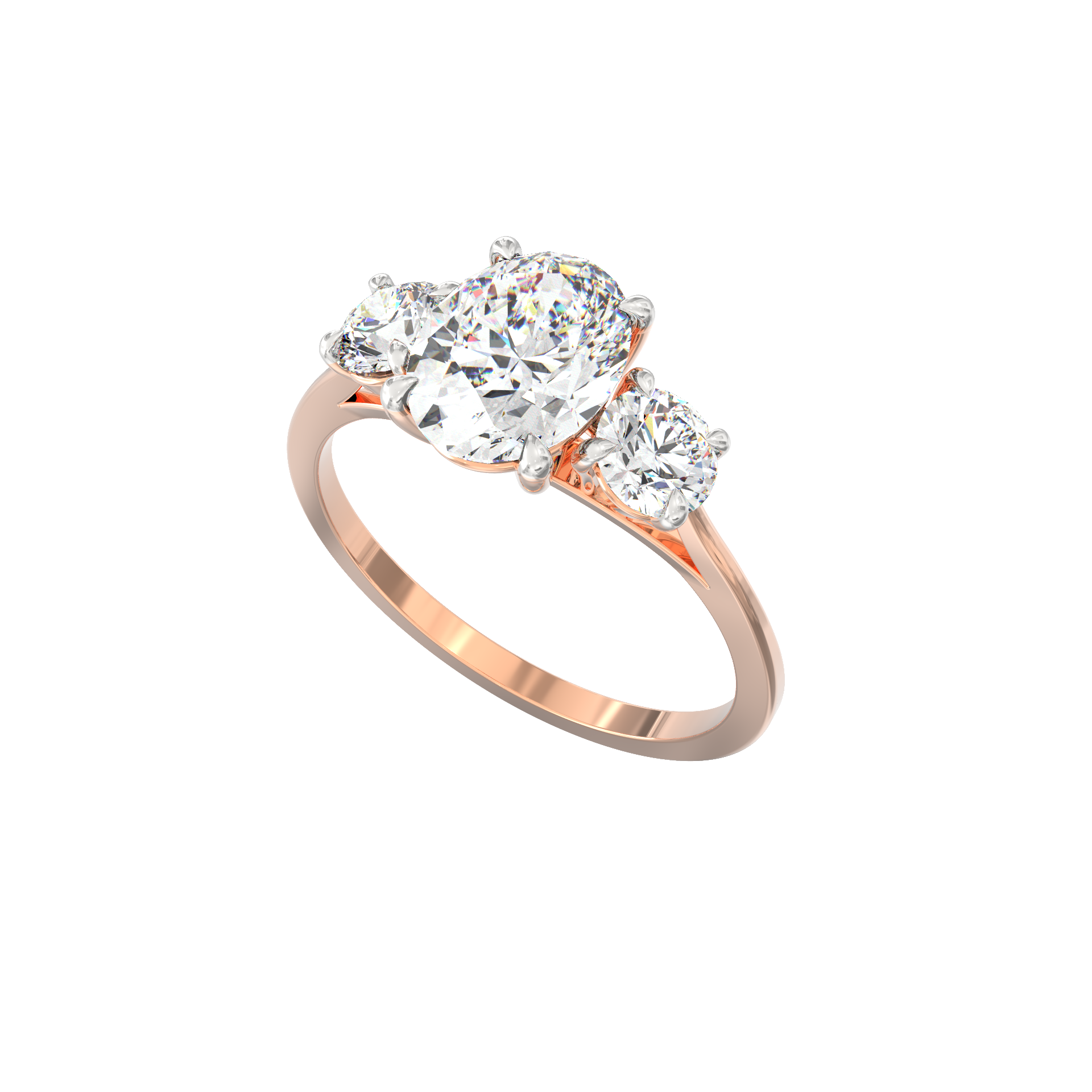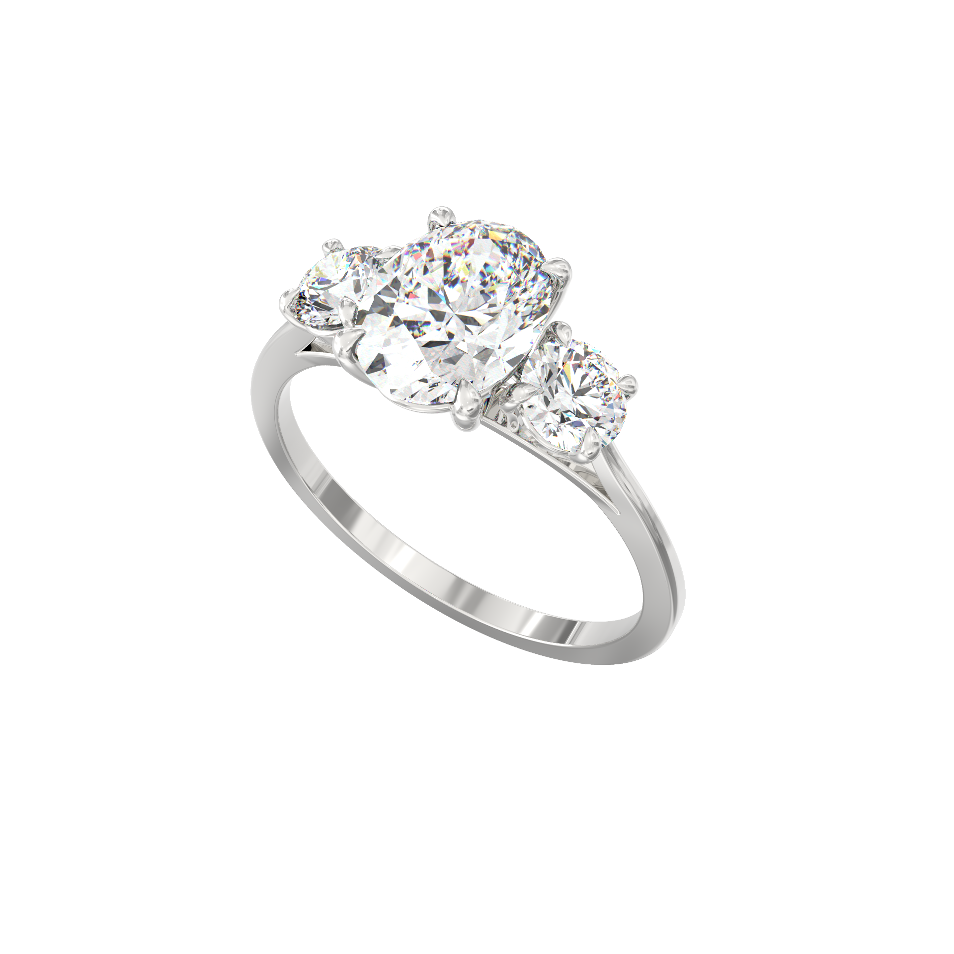The Seraphina oval three stone diamond ring brings together light, emotion, and meaning in a beautifully balanced form. At its center rests a 1.25 Ct oval-cut lab-grown diamond that glows with a soft, elongated brilliance. On each side, two round lab-grown diamonds totaling 1.08 Ct complete the trio, creating a smooth flow of sparkle that symbolizes the past, present, and future. Because of this graceful structure, the design feels complete and deeply personal.